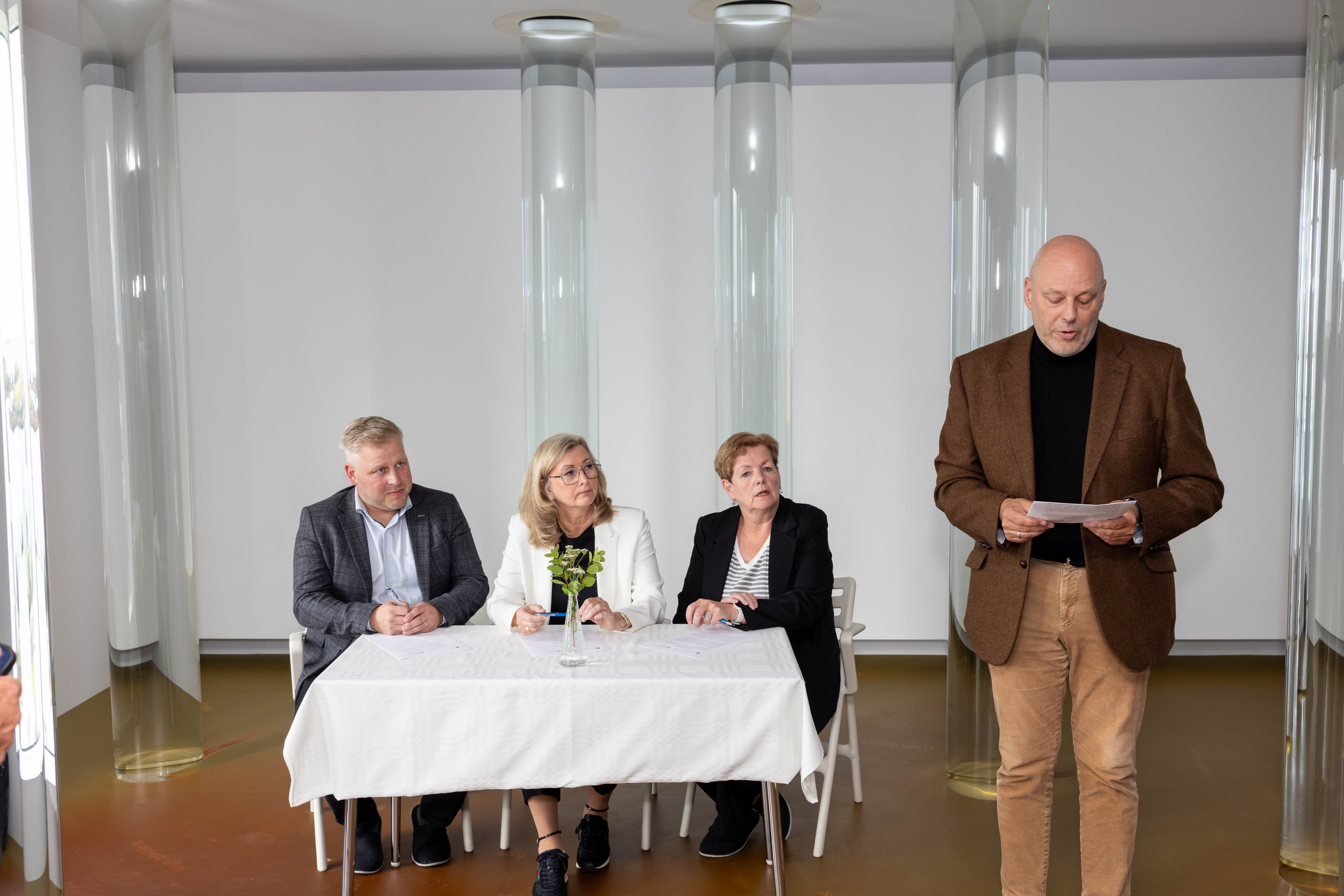 Skrifað var undir samninginn síðdegis í gær á Vatnasafninu í Stykkishólmi. F.v. Ragnar Sæmundsson formaður stjórnar SSV, Alma Möller heilbrigðisráðherra, Jóhanna Fjóla Jóhannesdóttir forstjóri HVE og Páll S Brynjarsson framkvæmdastjóri SSV. Ljósm. Skessuhorn/sá