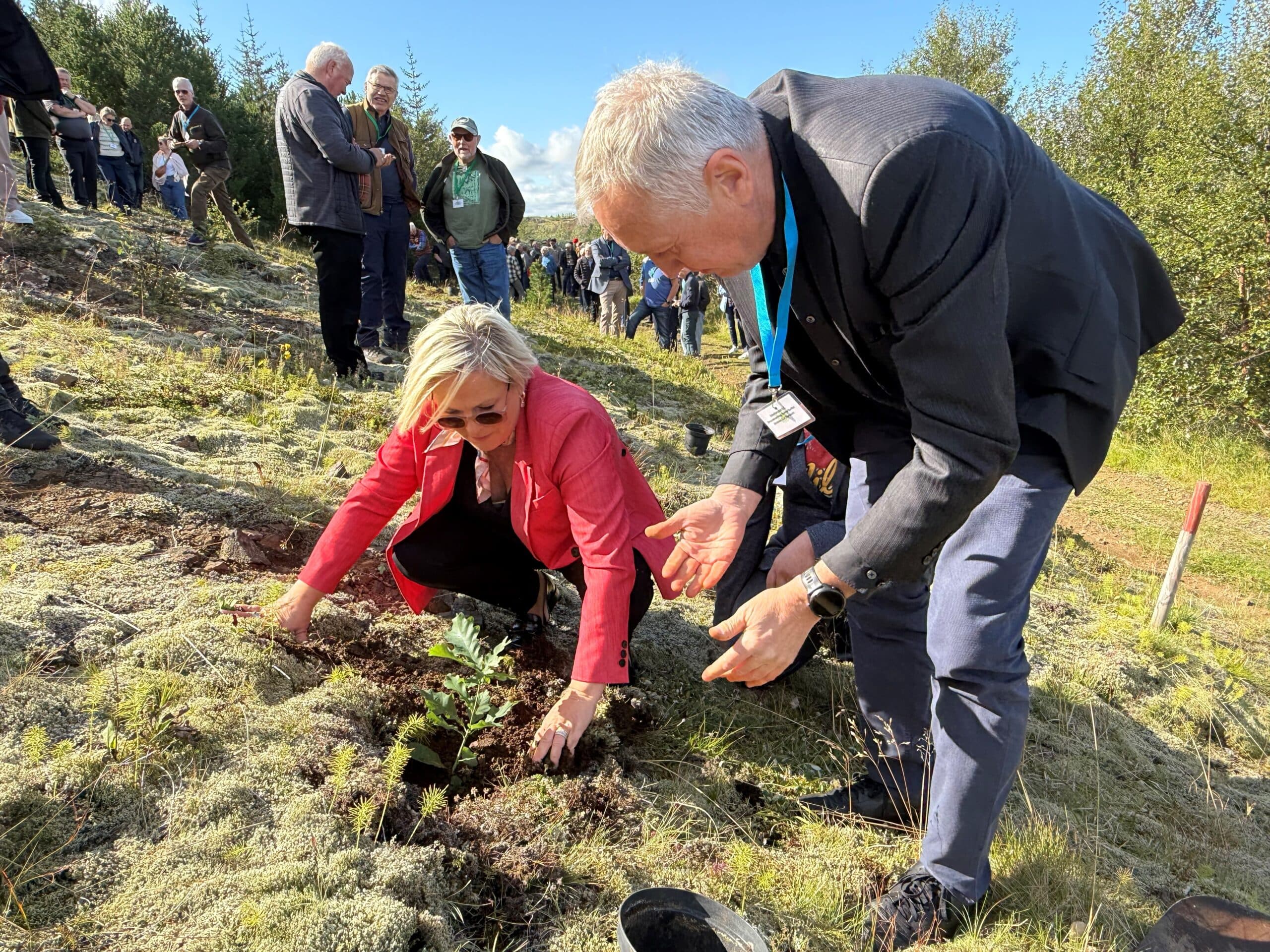 Aðalfundur Skógræktarfélags Íslands hófst í morgun í Þinghamri á Varmalandi með þátttöku á annað hundrað fulltrúa skógræktarfélaganna í landinu. Að loknum ávörpum gesta í morgun hófst hefðbundin dagskrá aðalfundar. Laust fyrir hádegi ávarpaði Halla Tómasdóttir forseti Íslands þingfundarfulltrúa en að því loknu tók hún þátt í að gróðursetja nokkur eikartré í Toyota lundinum á Varmalandi. Einmuna veðurblíða var í Borgarfirði í dag og nutu gestir stundarinnar. Einnig gróðursetti forseti plöntu af rauðu birki sem Þorsteinn Tómasson hefur stundað víxlræktun á í fjóra áratugi, en hann hefur verið óþreytandi að stunda kynbætur á íslenska birkinu.