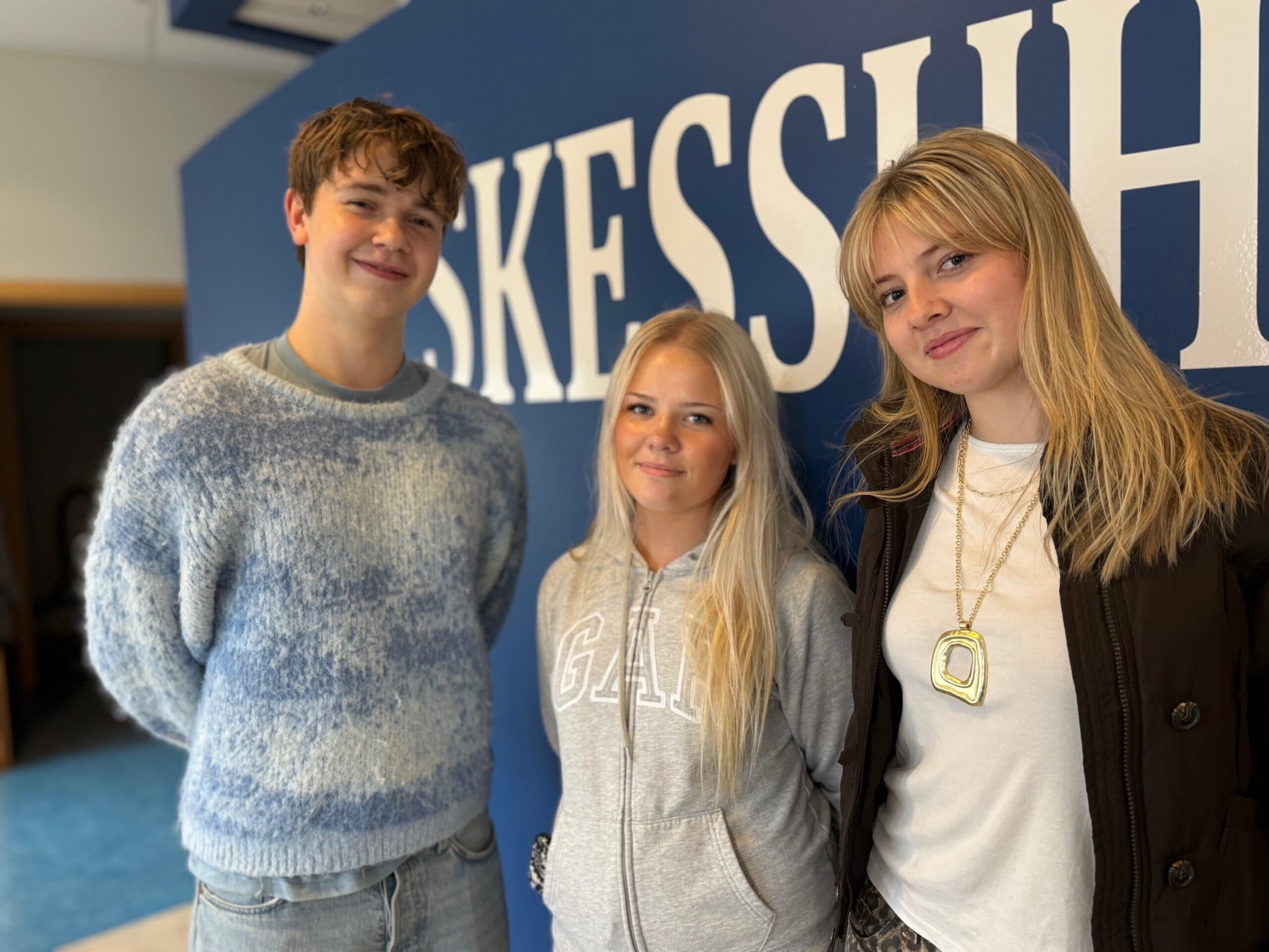 Þau Magnús Ingi Árnason, Kolbrún Emma Óskarsdóttir og Elísabet Yrsa Viktorsdóttir komu við á ritstjórn Skessuhorns en ein af áskorunum dagsins var einmitt að komast í fréttirnar. Það tókst og gefur bekknum hundrað stig!
