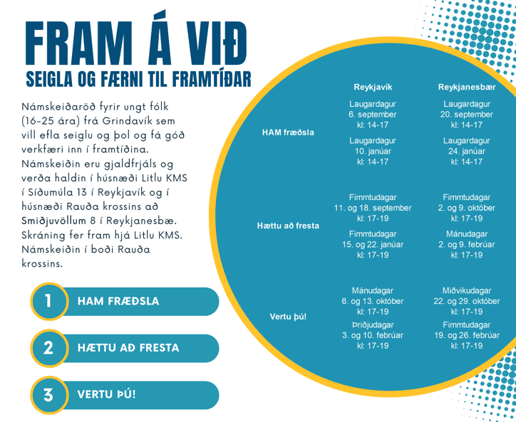 Ungu fólki úr Grindavík á aldrinum 16-25 ára býðst í haust og vetur að sækja ókeypis námskeið sem hluta af verkefninu Viðnámsþróttur Suðurnesja. Markmiðið er að efla seiglu og sjálfstraust og veita hagnýt verkfæri sem nýtast í daglegu lífi til framtíðar. Sérfræðingar Litlu Kvíðameðferðarstöðvarinnar standa að námskeiðunum og eru þau í boði Rauða krossins. Fyrirtækið Rio Tinto er styrktaraðili verkefnisins.