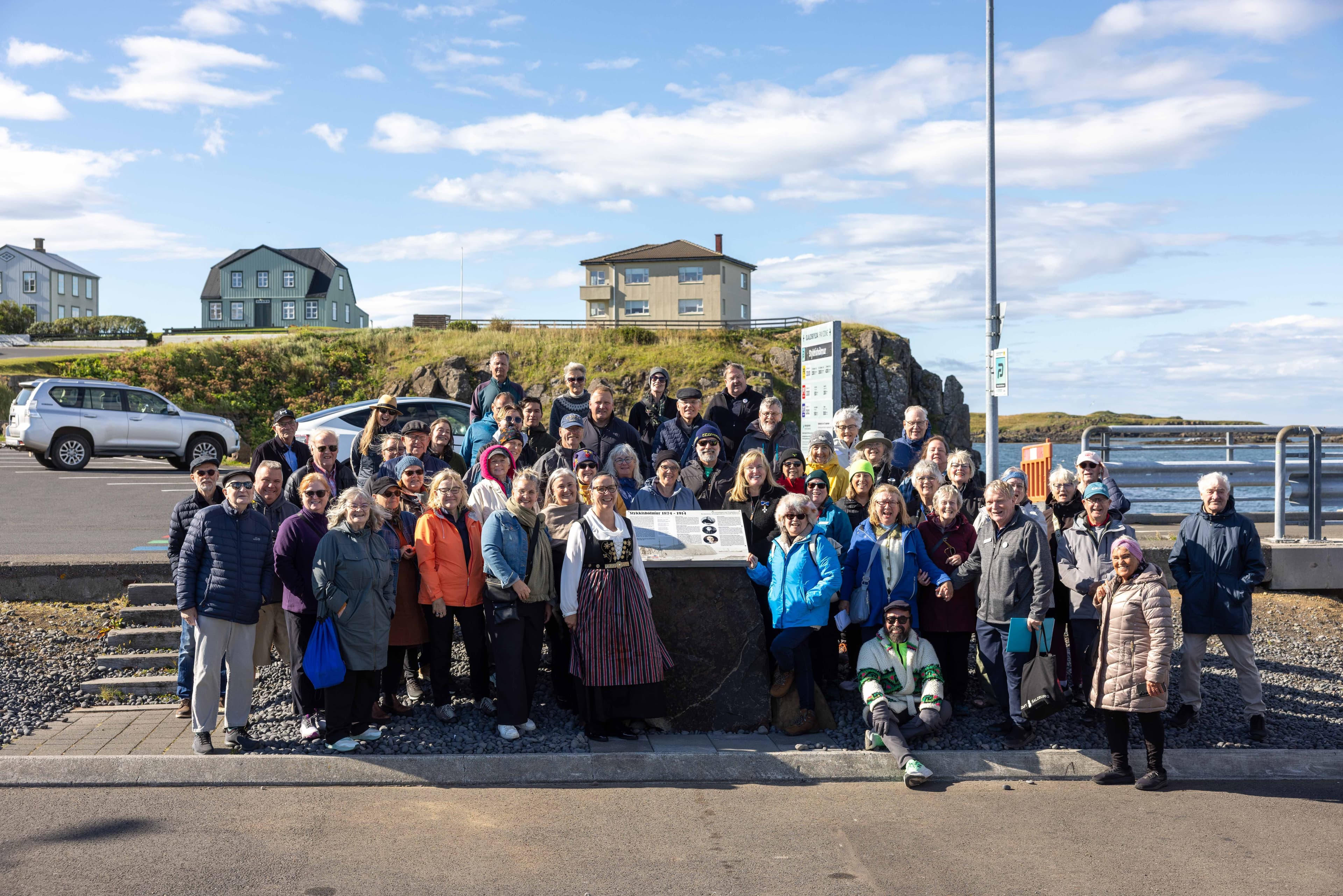 Dágóður hópur afkomenda vesturfaranna, ásamt heimafólki, var mættu við afhjúpun skiltisins. Ljósm. sá