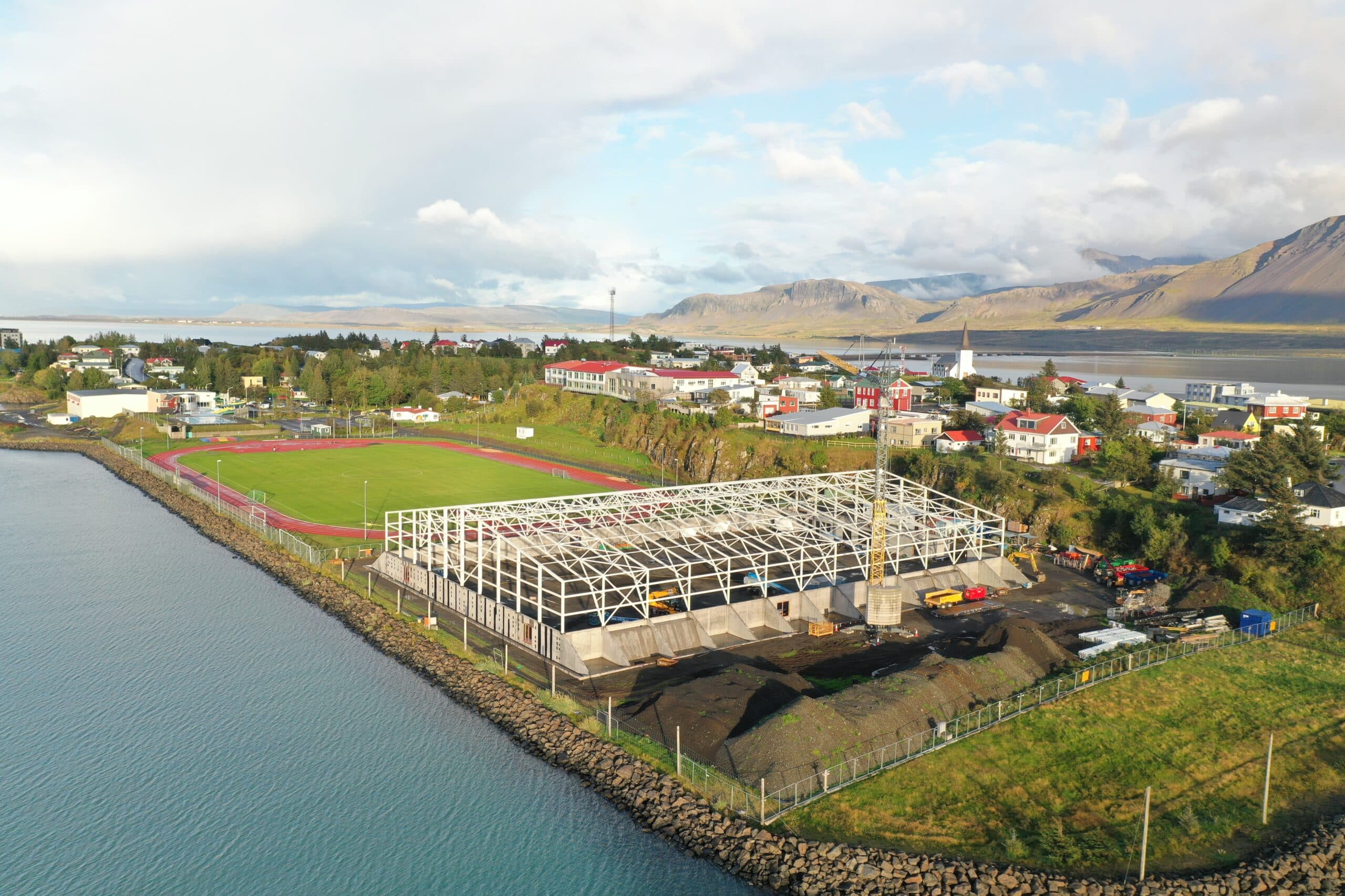 Eftir að búið er að reisa sperrur sést hvernig nýja íþróttahúsið mun líta út. Ljósm. mm