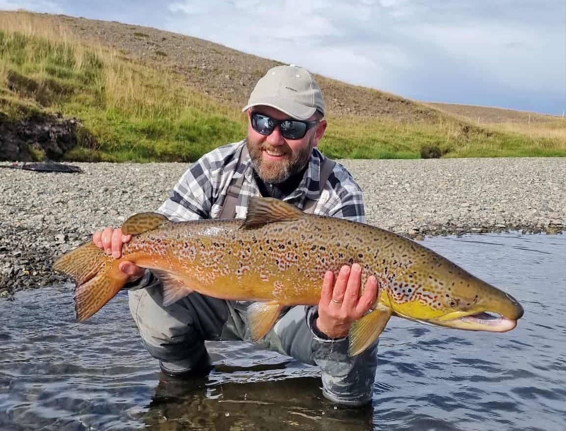Jóhann Unnar Sigurðsson veiðimaður lenti í skemmtilegu ævintýri síðastliðinn föstudagsmorgun þegar hann setti í og landaði 105 cm laxi í Miðá í Dölum. Samkvæmt okkar bókum er þetta stærsti lax sem veiðst hefur í sumar, en nú er einmitt tími stórhænganna að ganga í garð. Laxinn veiddi Jóhann í Hamarshyl og tók hann svarta Frances #14. Baráttan stóð yfir í um tvær klukkustundir.