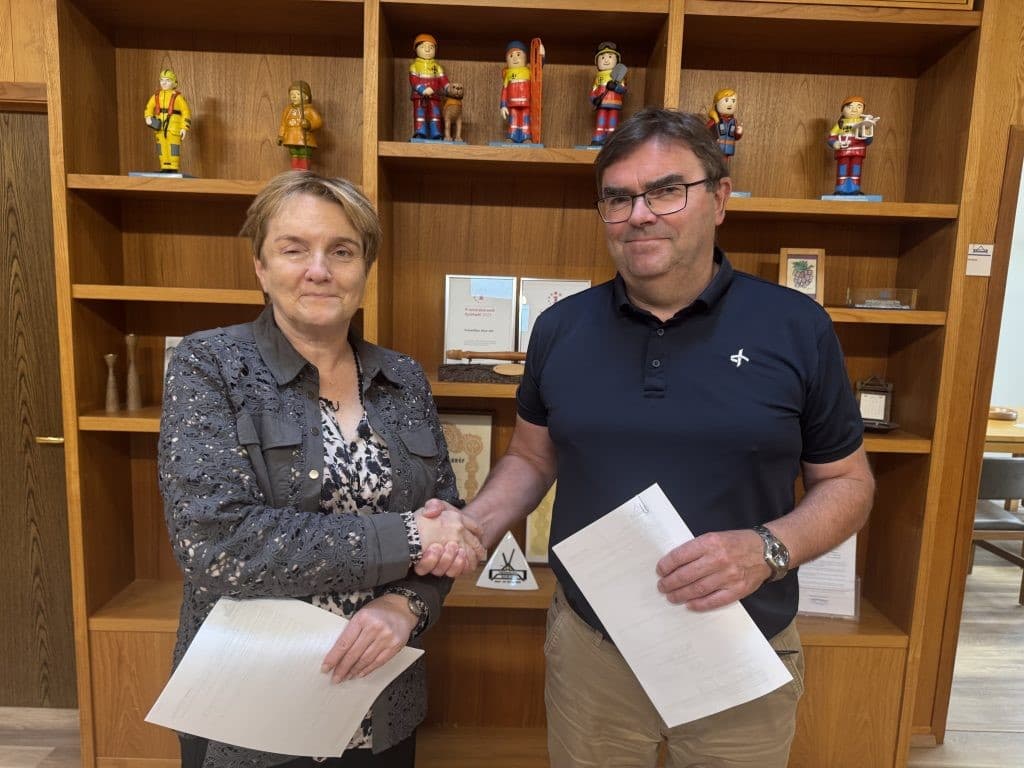 Hrefna B Jónsdóttir framkvæmdastjóri handsalar hér samninginn við Halldór Stefánsson framkvæmdastjóra Trésmiðjunnar Akurs. Ljósm. ssv