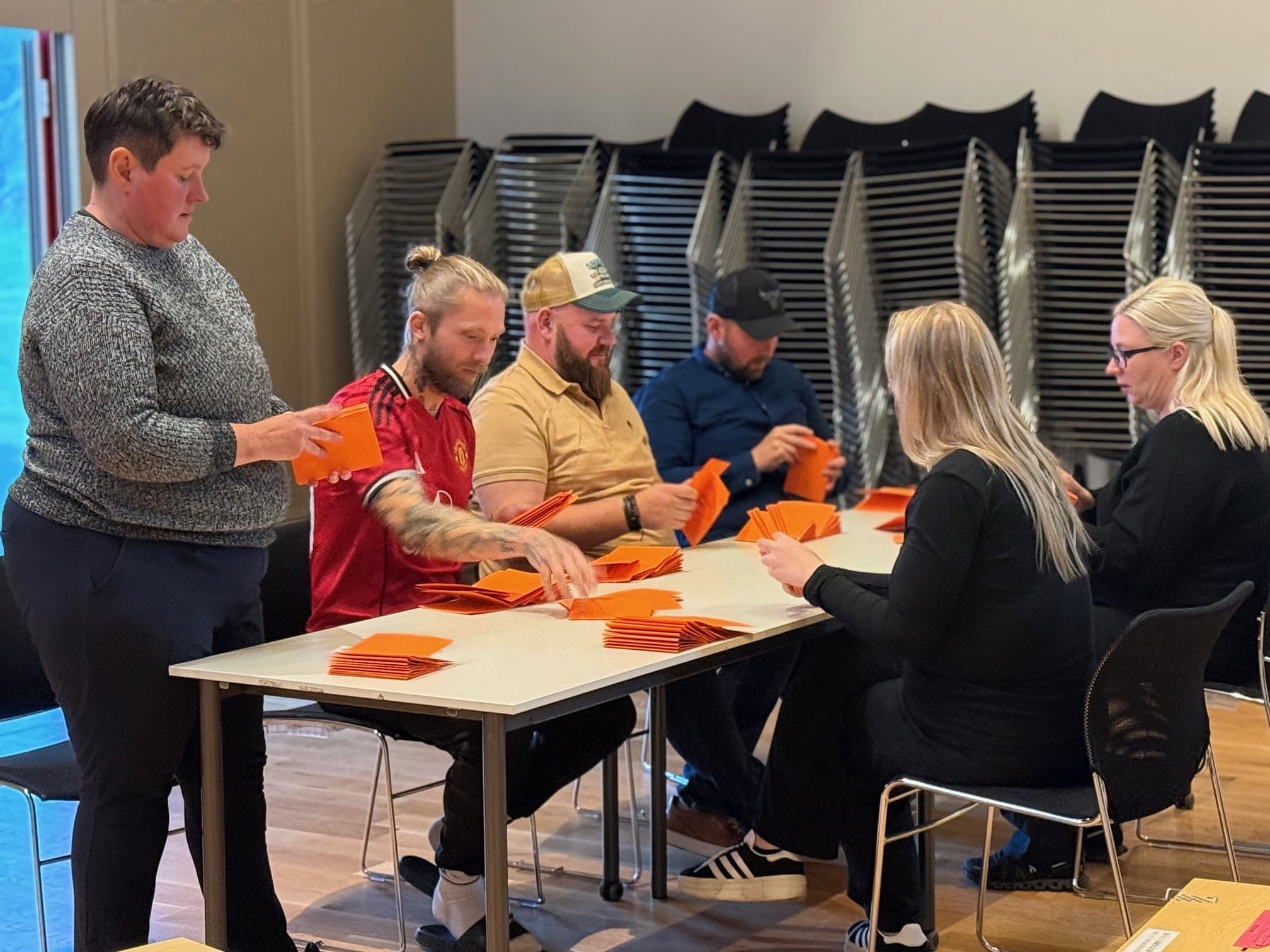 Talningarfólk að störfum í Hjálmakletti í Borgarnesi að kvöldi 20. september. Ljósm. mm