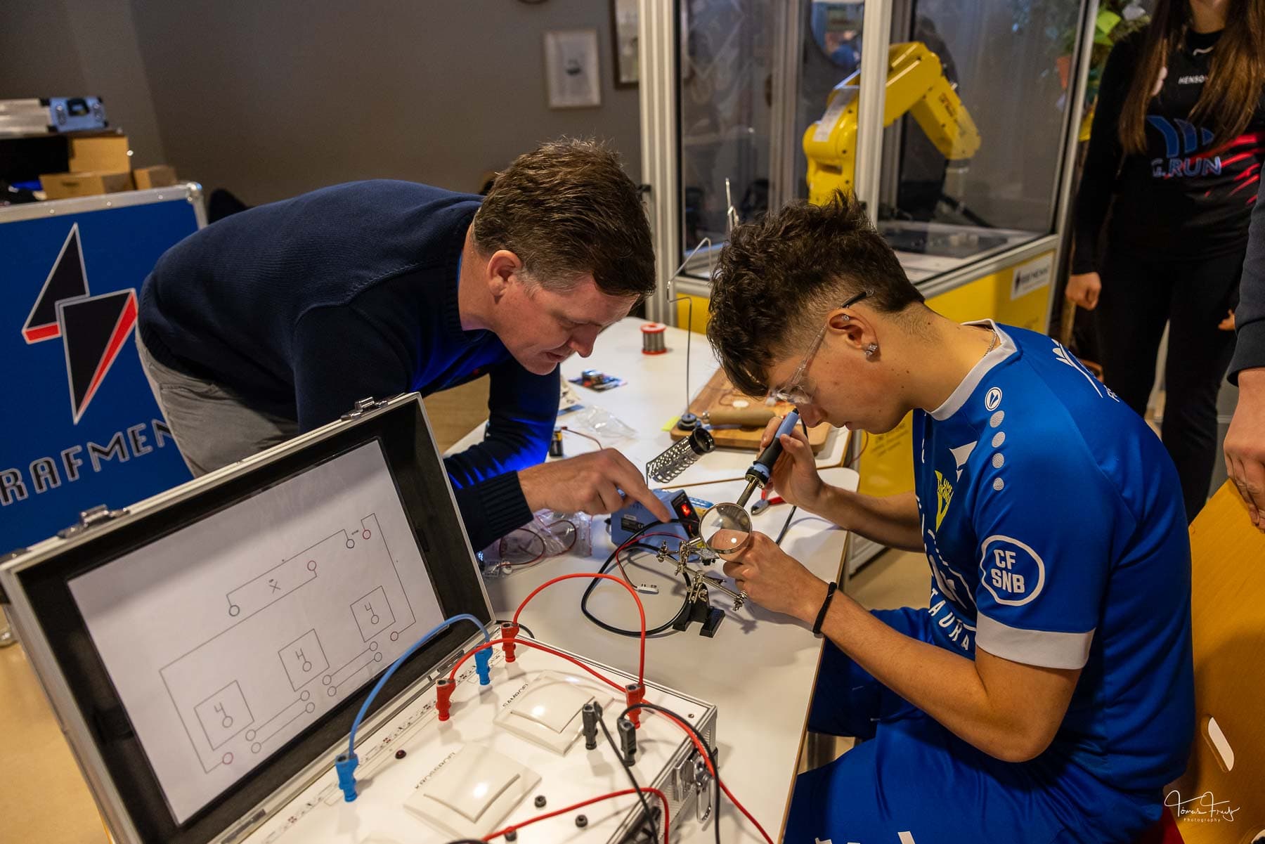 Starfsmaður hjá Rafmennt leyfir áhugasömum nemanda að beita sér með lóðbolta. Ljósmyndir: tfk