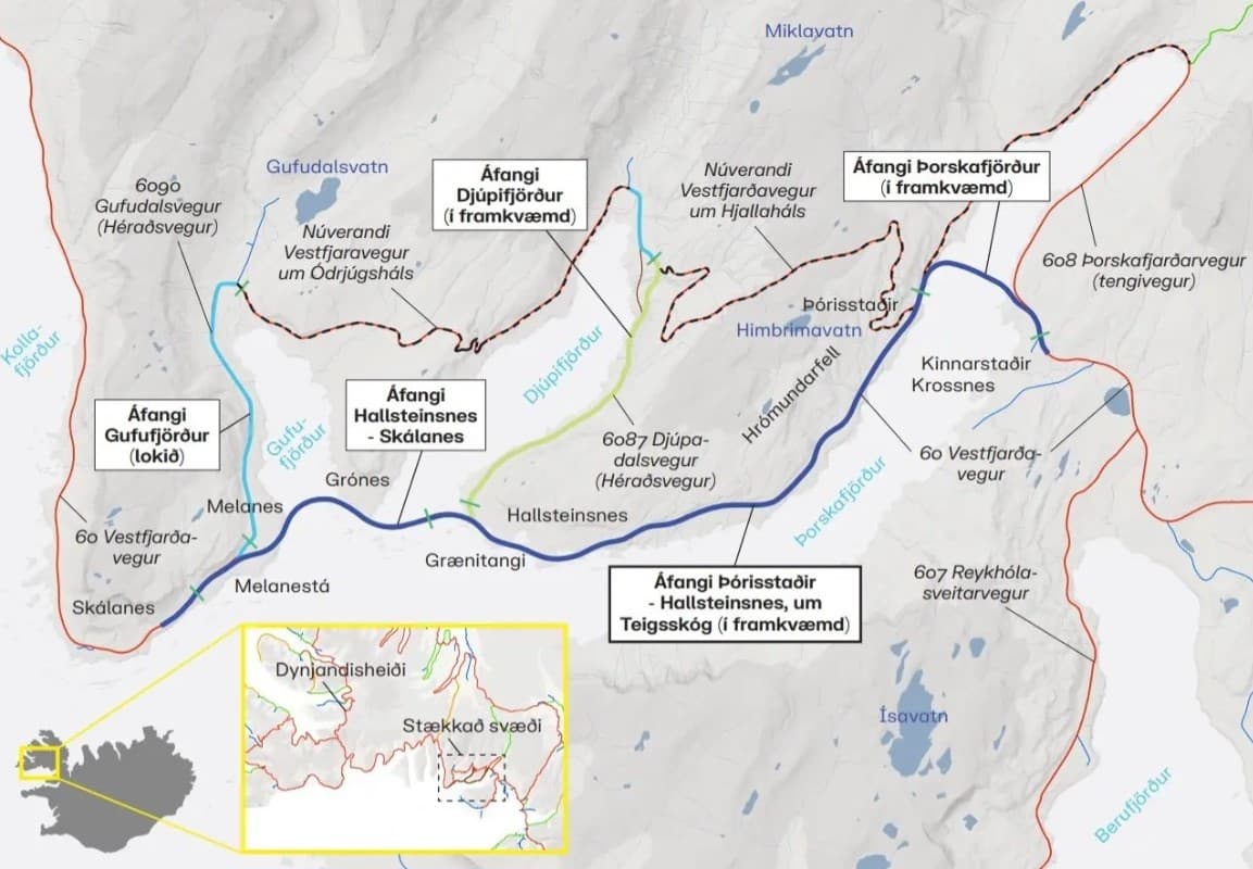 Kort sem sýnir áfanga við vegaframkvæmdir í Gufudalssveit. Kortið er nokkurra ára gamalt en gefur ágæta mynd af veglínunni og framkvæmdunum sem nú er verið að semja um.