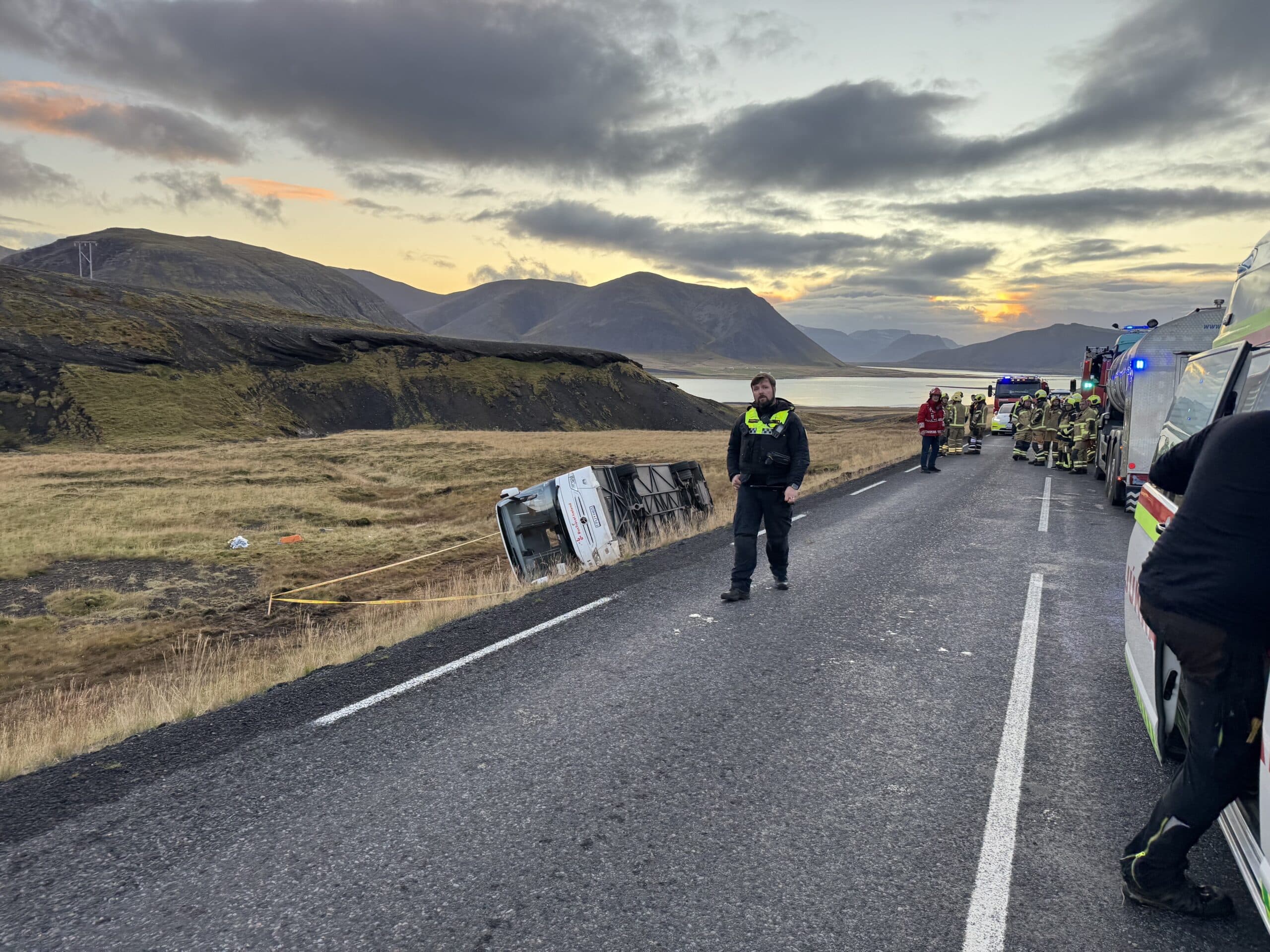 Rútan lendir útaf veginum og hafnar á hliðinni, eins og sjá má á meðfylgjandi mynd. Tveir farþegar voru fluttir með þyrlu Landhelgisgæslunnar á Landspítalann í Reykjavík, átta farþegar voru fluttir með sjúkrabílum og björgunarsveitarbílum á Heilbrigðisstofnun Vesturlands á Akranesi og þrír til aðhlynningar í Grundarfirði, en fjöldahjálparstöð var opnuð í Fjölbrautaskóla Snæfellinga til að hlúa að mannskapnum.