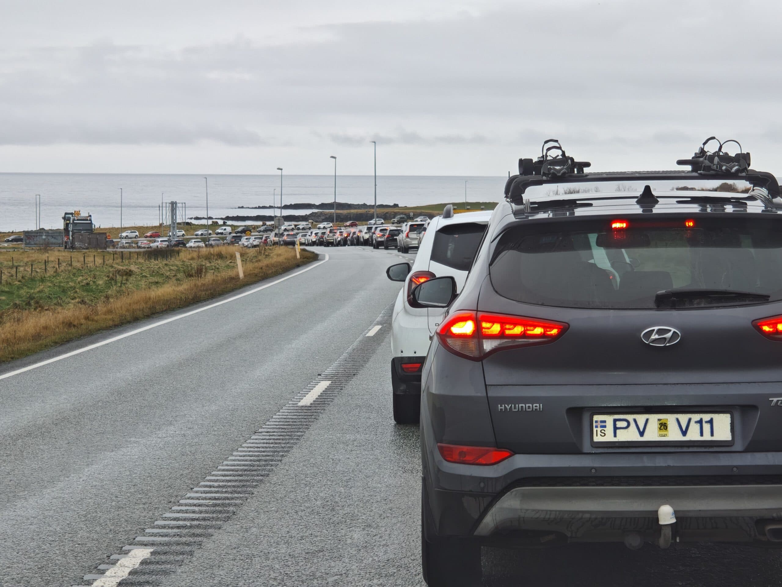 Löng bílaröð hefur myndast við göngin, en óvíst er hvenær þau verða opnuð að nýju. Ljósm. af