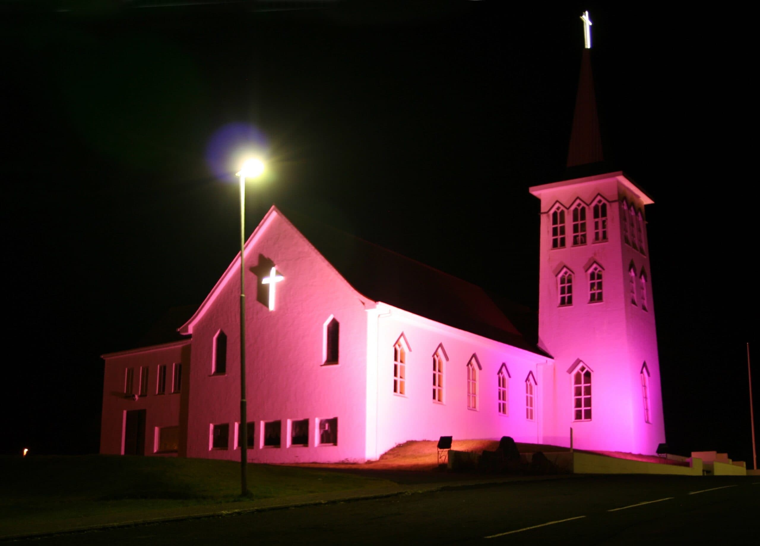 Um 350 kirkjubyggingar tilheyra sóknum landsins. Hér er Grundarfjarðarkirkja böðuð bleiku ljósi. Ljósm. úr safni