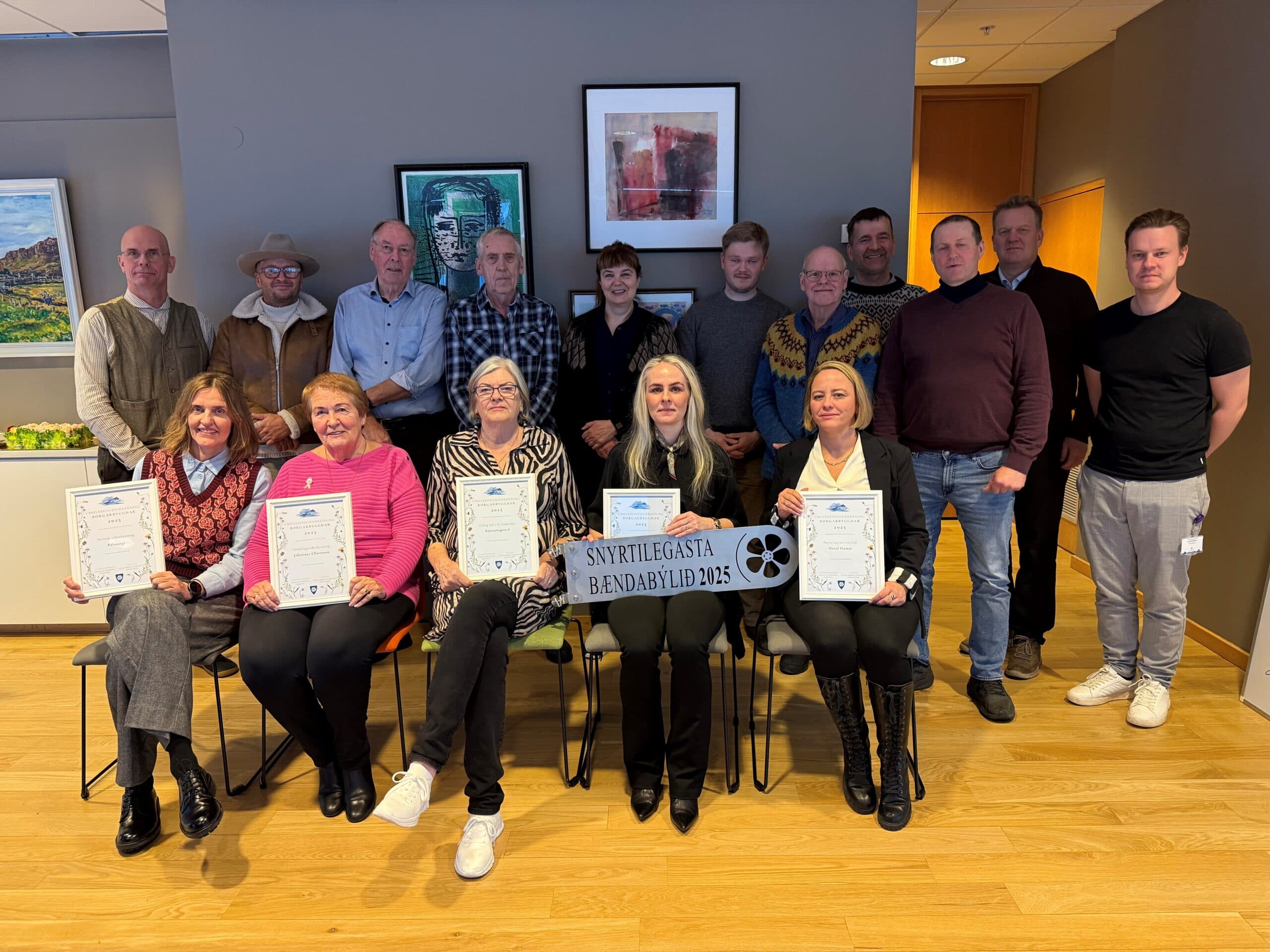 Verðlaunahafar ásamt sveitarstjóra, nefndarfólki í umhverfis- og landbúnaðarnefnd og Loga, starfsmanni nefndarinnar. Ljósmyndir: mm