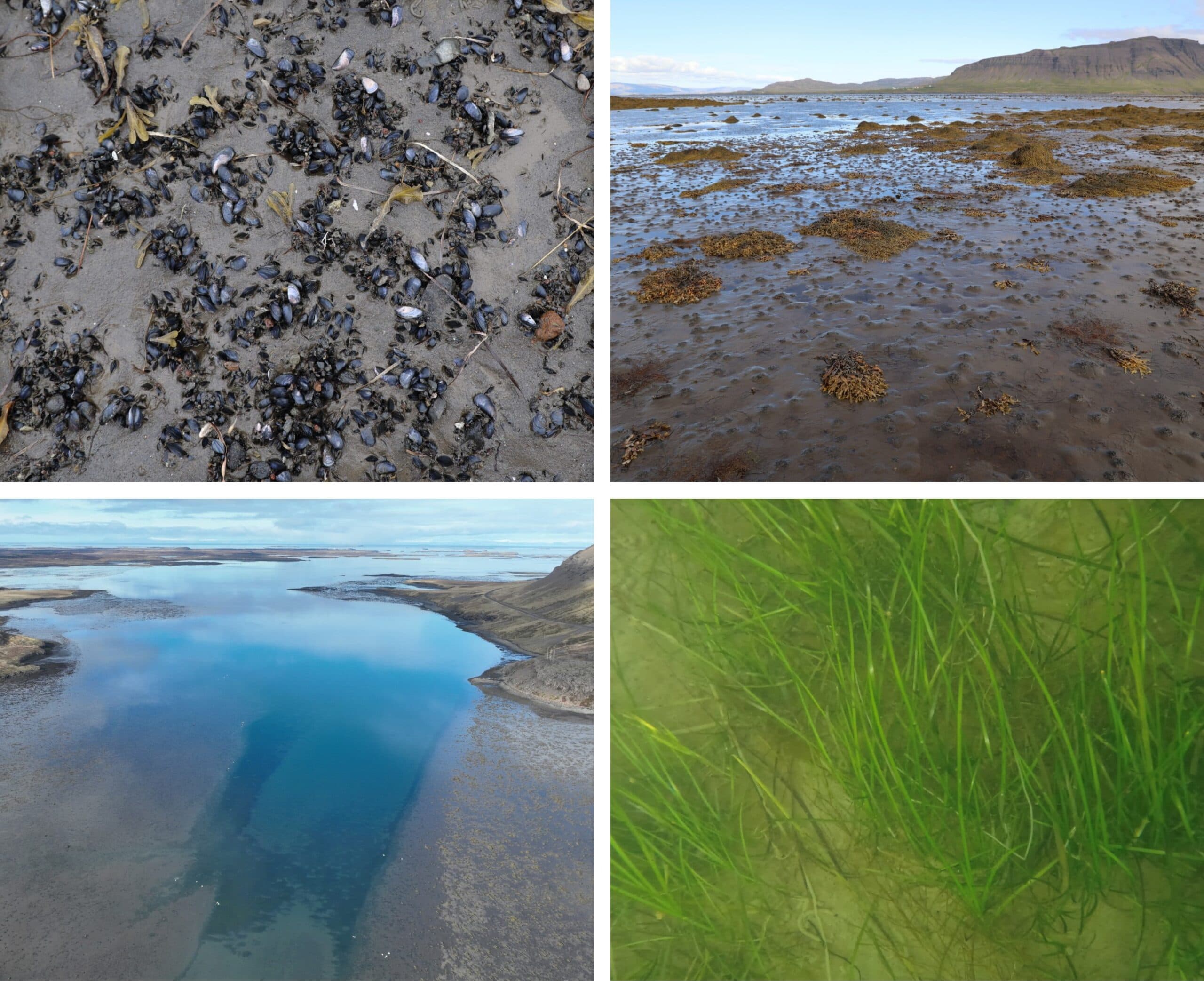 Samsett ljósmynd sem sýnir kræklingaleiru, sandmaðksleira, Álftafjörður úr lofti og marhálmur. Ljósm. Náttúrustofa Vesturlands.