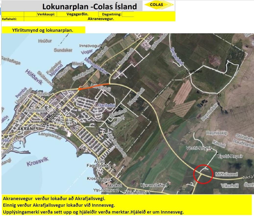 Vegagerðin hefur gefið Colas heimild til eftirtalinna verka ef veður leyfir: „Í dag, miðvikudaginn 12. nóvember, er stefnt á malbikunarframkvæmdir á Akranesvegi. Veginum verður lokað á milli Innnesvegar og Akrafjallsvegar. Hjáleið verður um Innnesveg. Viðeigandi merkingar og hjáleiðir verða settar upp skv. viðhengdri merkingaráætlun. Áætlað er að framkvæmdirnar standi frá kl. 09:00 til kl. 17:00 miðvikudaginn 12. nóvember.“