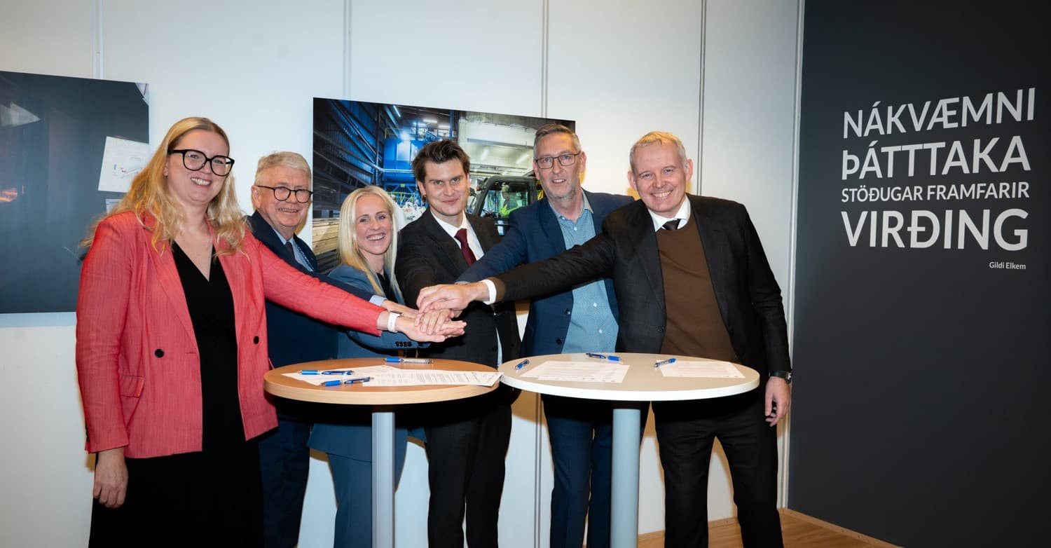 Eftir undirritun var handaband. F.v. Edda Aradóttir framkvæmdastýra Carbfix, Guðjón Steindórsson framkvæmdastjóri Þróunarfélags Grundartanga, Álfheiður Ágústsdóttir forstjóri Elkem á Íslandi, Jóhann Páll Jóhannsson umhverfis-, orku- og loftslagsráðherra, Árni Hrannar Haraldsson framkvæmdastjóri ON og Sævar Freyr Þráinsson forstjóri Orkuveitunnar. Ljósm. Einar Örn Jónsson