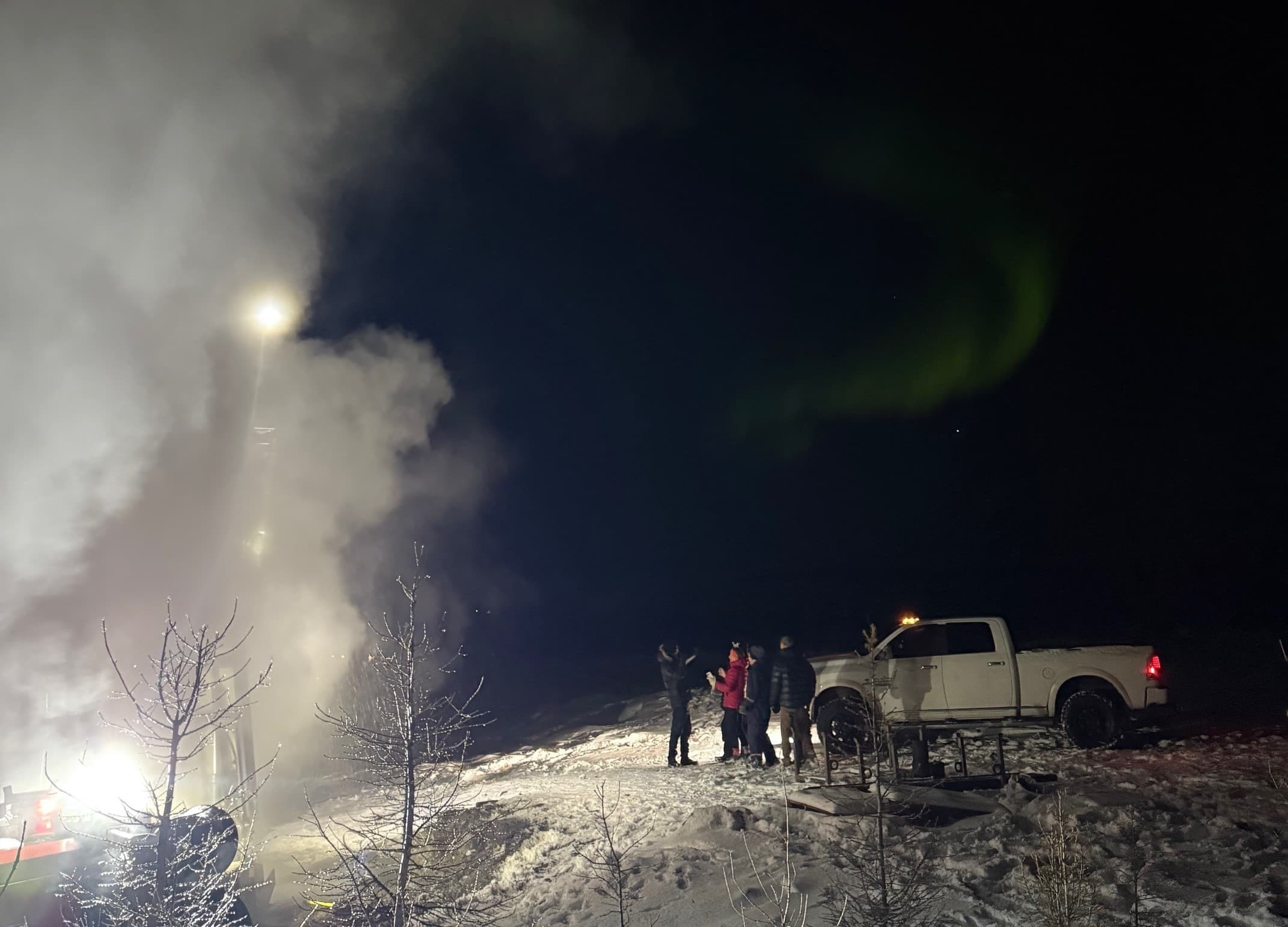 Það var gleðileg stund þegar ljóst var að borað hafði verið niður á álitlega heitavatnsæð á 572 metra dýpi. Ljósmyndir: Finnur ehf