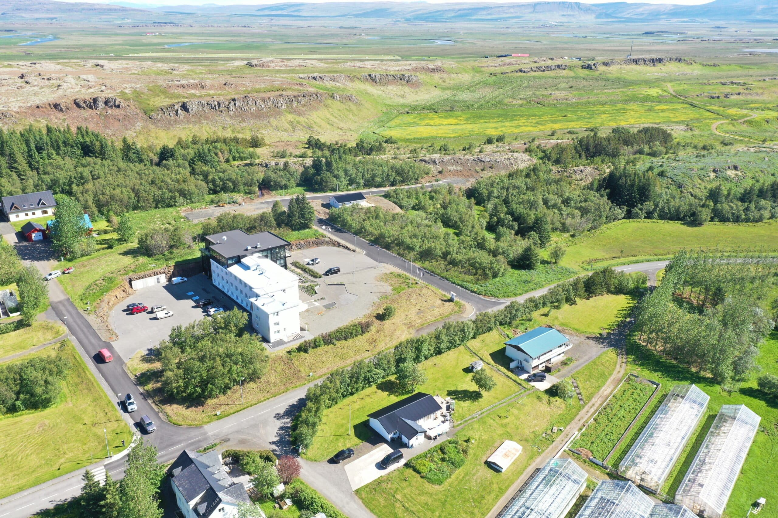 Á myndinni má m.a. sjá hluta gróðrarstöðvarinnar á Laugalandi, Hótel Varmaland og götuna sem liggur að íbúðabyggðinni hvar deiliskipulagið hefur nú verið dæmt ógilt. Ljósm. mm