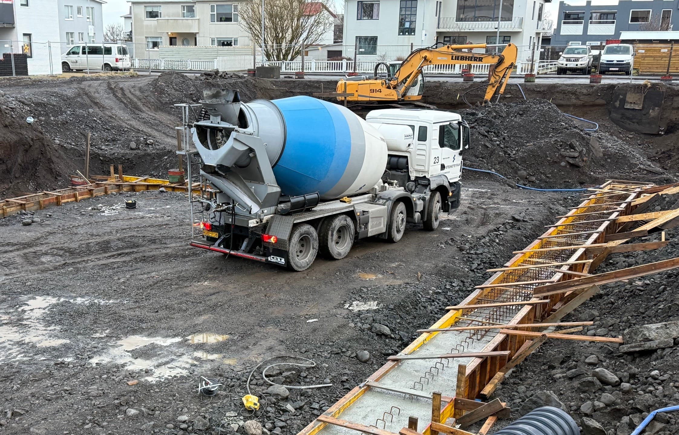 Í morgun hófst steypuvinna á lóð Kirkjubrautar 39 á Akranesi. Eins og fram hefur komið í fréttum Skessuhorns mun þar rísa hús með íbúðum á efri hæðum auk verslunar- og þjónusturýma á jarðhæð og bílakjallara. Undanfarnar vikur hefur vinna við grunn byggingarinnar staðið yfir en sú vinna hefur verið talsvert flókin vegna tilfærslu fjölda lagna en miðstöð símaþjónustu Mílu og tengdra fyrritækja er í næsta húsi, í gömlu símstöðinni.
