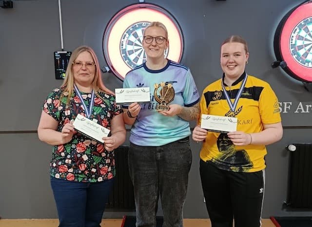 Fyrsta 501 kvennamót Pílufélags Akraness fór fram í gær í kjallara íþróttahússins við Vesturgötu. Sautján konur tóku þátt en spilað var í fjórum riðlum og útsláttarkeppni. „Viktoría stóð uppi sem sigurvegari og hlaut ekki bara glæsilegan verðlaunagrip heldur einnig gjafabréf í Kallabakaríi. Dísa tók annað sætið, ásamt silfurpening og gjafabréfi í Kallabakaríi. Það var svo Emilía sem sigraði Heiðrúnu í baráttunni um bronsið og fékk hún gjafabréf í Kallabakaríi.