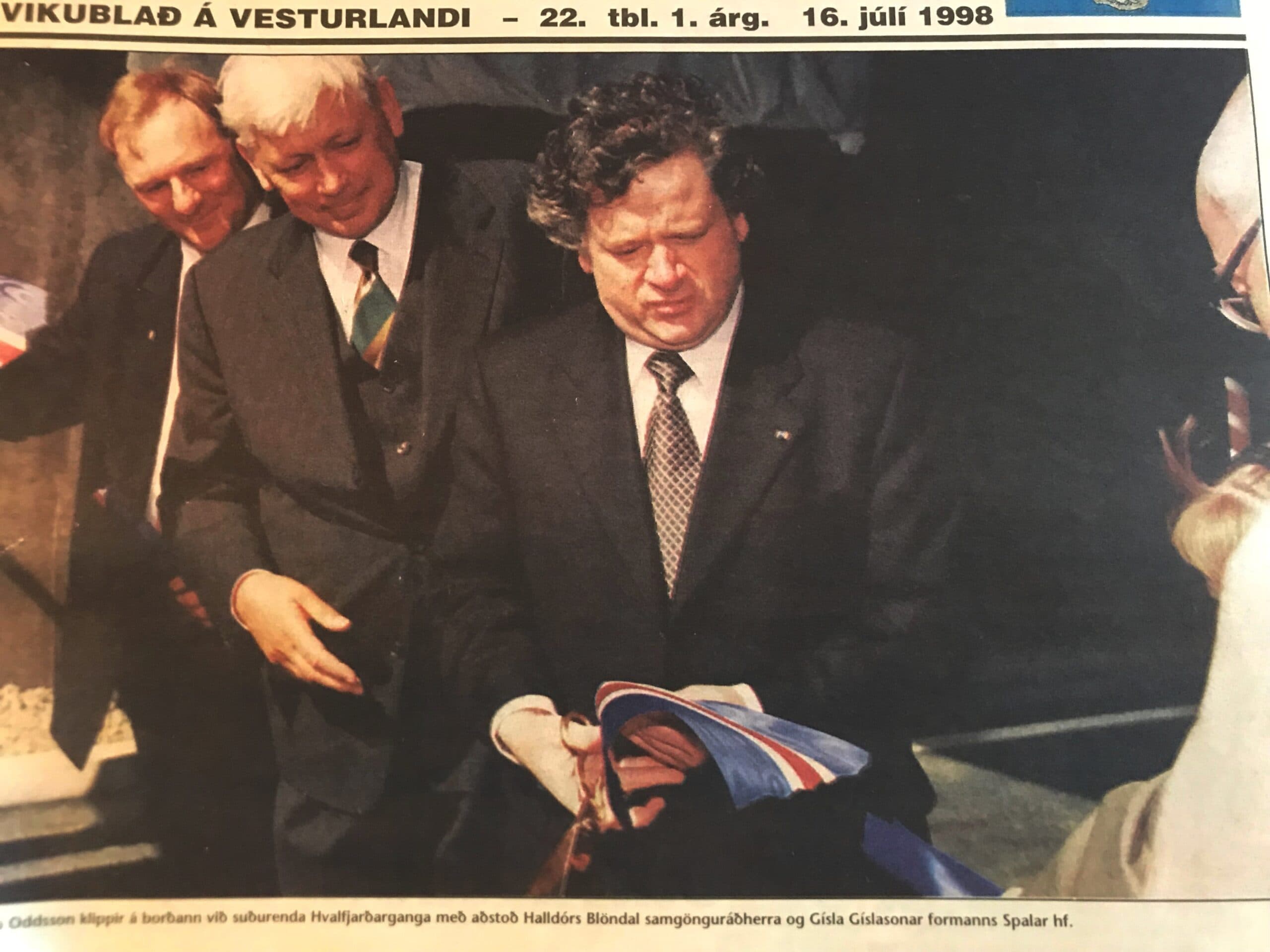 Hvalfjarðargöng voru vígð 11. júlí 1998, nokkrum mánuðum eftir að Skessuhorn hóf útgáfu. Hér eru Gísli Gíslason formaður Spalar, Halldór Blöndal samgönguráðherra og Davíð Oddsson forsætisráðherra sem klippir á borðann. Ljósm. Gísli Einarsson