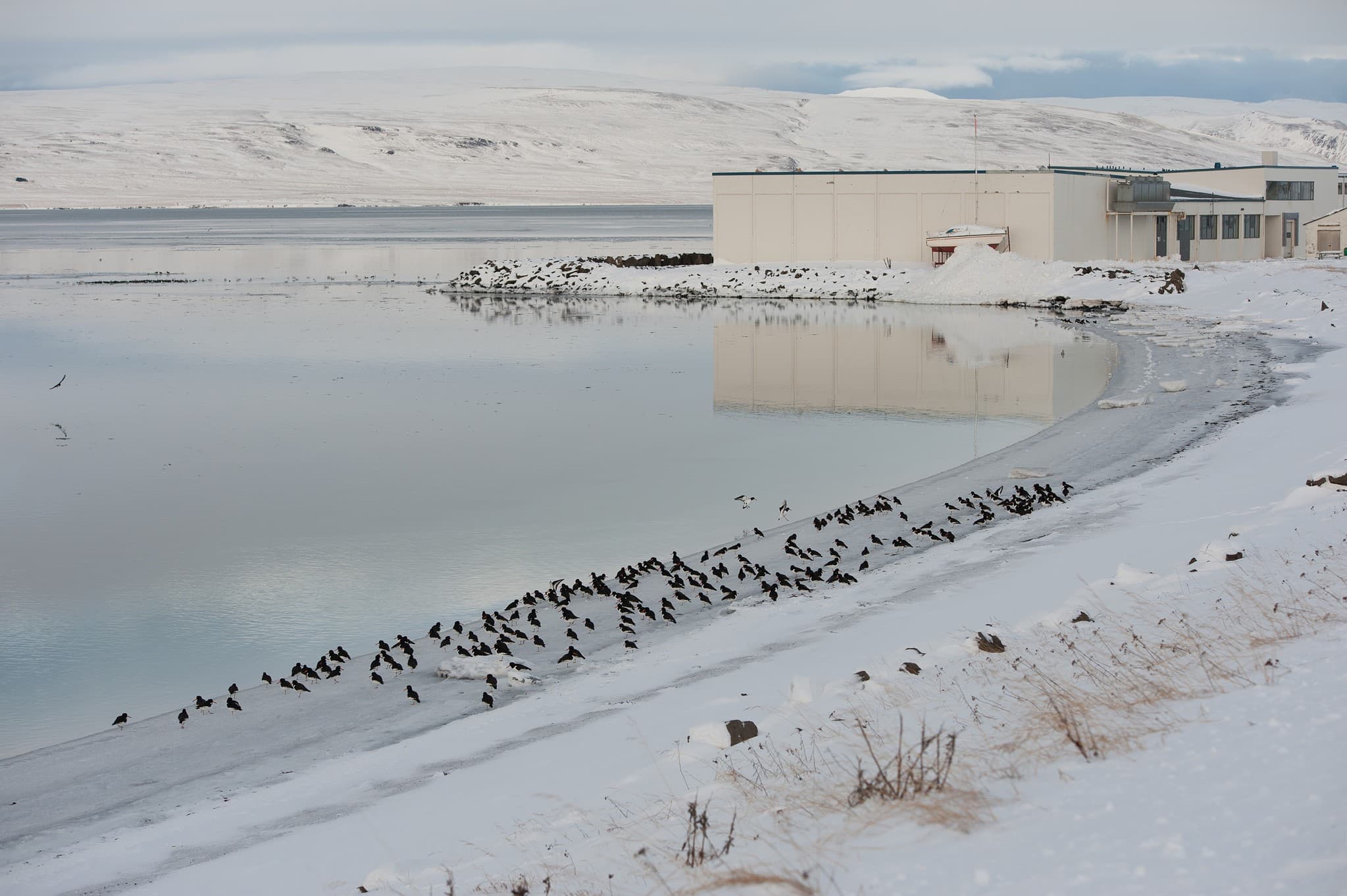 Vænn hópur af tjaldi spókar sig hér í fjörunni sunnan við sláturhúsið í Búðardal 11. febrúar 2016, sem var óvenju snemmt hjá þessum fugli að mæta til landsins. Tjaldurinn reyndar elskar vegi meira en nokkrir aðrir fuglar hér á landi. Ljósm. Steina Matt