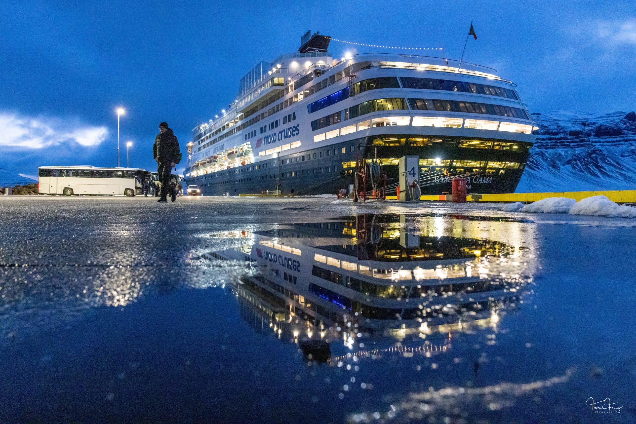 Vasco da Gama var síðasta skemmtiferðaskip ársins í Grundarfirði, kom undir lok október. Farþegi af skipinu gengur hér frá borði á meðan ljósum prýtt skipið speglaðist í bryggjugólfinu. Ljósm. úr safni/tfk