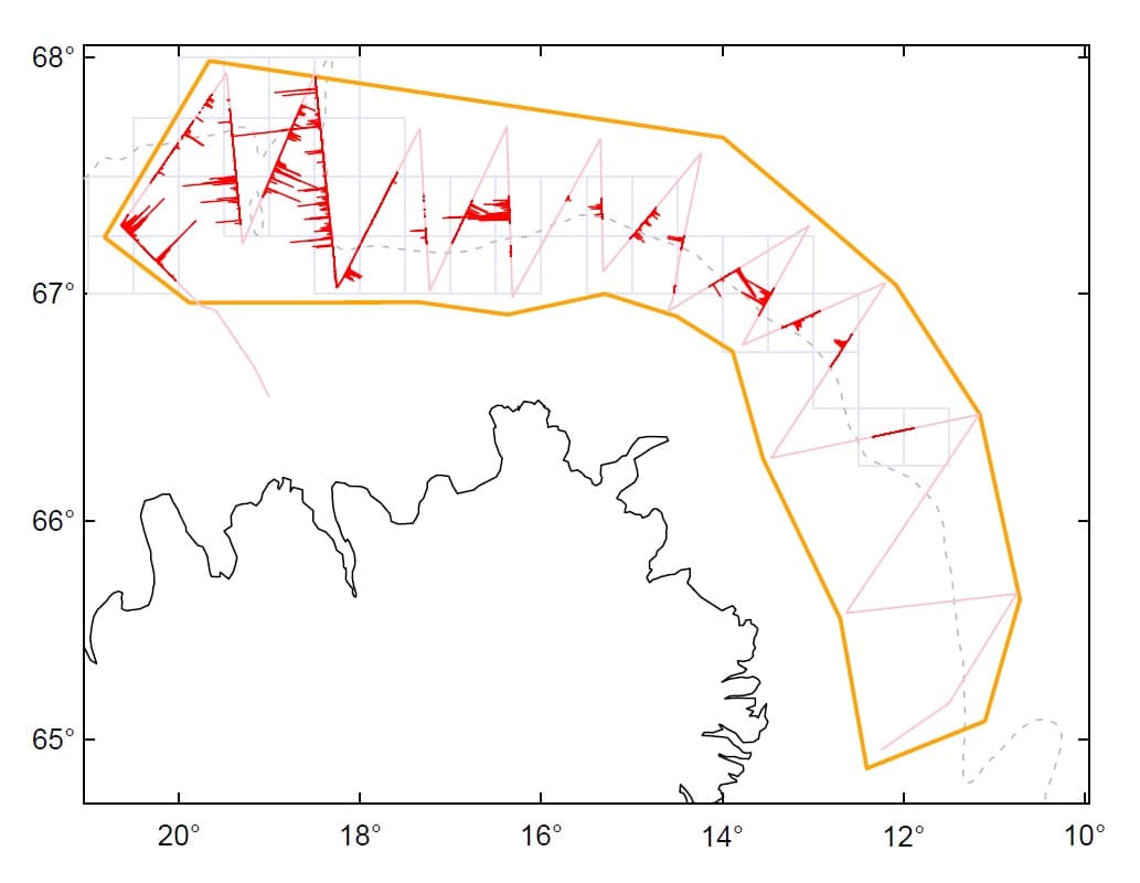 Leiðangurslínur Árna Friðrikssonar í loðnukönnun 5.-12. janúar 2026 (bleikar) ásamt bergmálsgildum fyrir loðnu (rauðar línur hornrétt á leiðarlínur). Gráa línan sýnir 400 metra dýptarlínu. Teikning: hafro.is