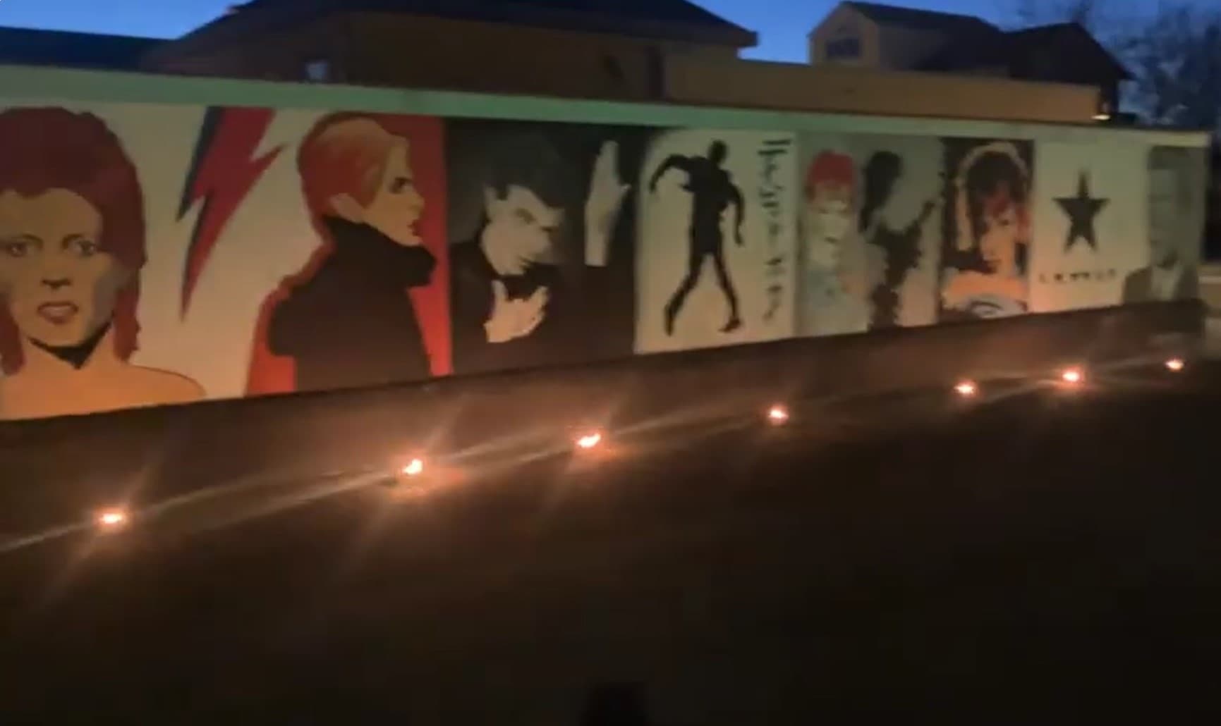 Hópur aðdáenda David Bowie kom saman við Bowie vegginn á Akranesi síðdegis í gær og kveiktu á kertum. Minntust þeir þess að tíu ár voru þá frá andláti söngvarans.