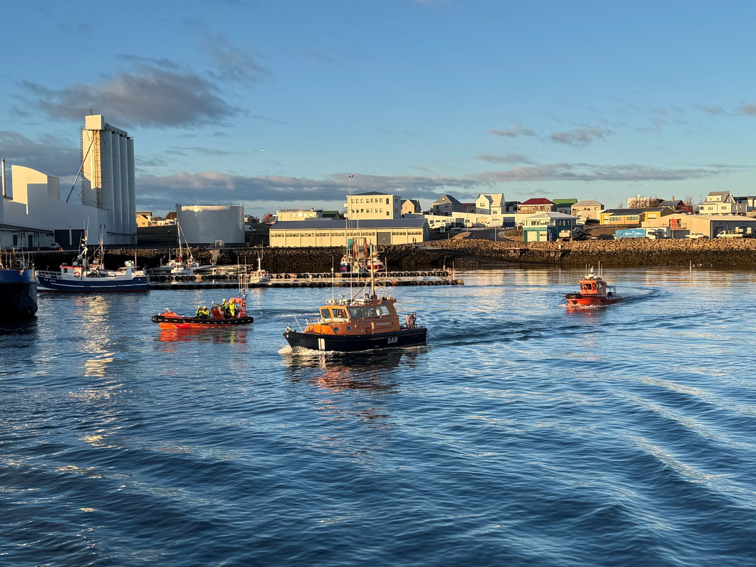 Aðstæður til siglinga um sundin voru ákjósanlegar í dag; hægur vindur og hiti um frostmark. Þá töluðu sig saman fulltrúar þriggja björgunarsveita sem reka björgunarkip og héldu æfingu. Auk björgunarskipsins Jóns Gunnlaugssonar í eigu Björgunarfélags Akraness voru á siglingu Fiskaklettur í Hafnarfirði í eigu Björgunarsveitar Hafnarfjarðar og Stefnir úr Kópavogi í eigu Hjálparsveitar Skáta. Meðal annars var siglt inn í höfnina á Akranesi og gátu menn miðlað þekkingu. Heimamenn buðu svo gestunum í kaffi og hressingu áður en haldið var út á sundin að nýju.