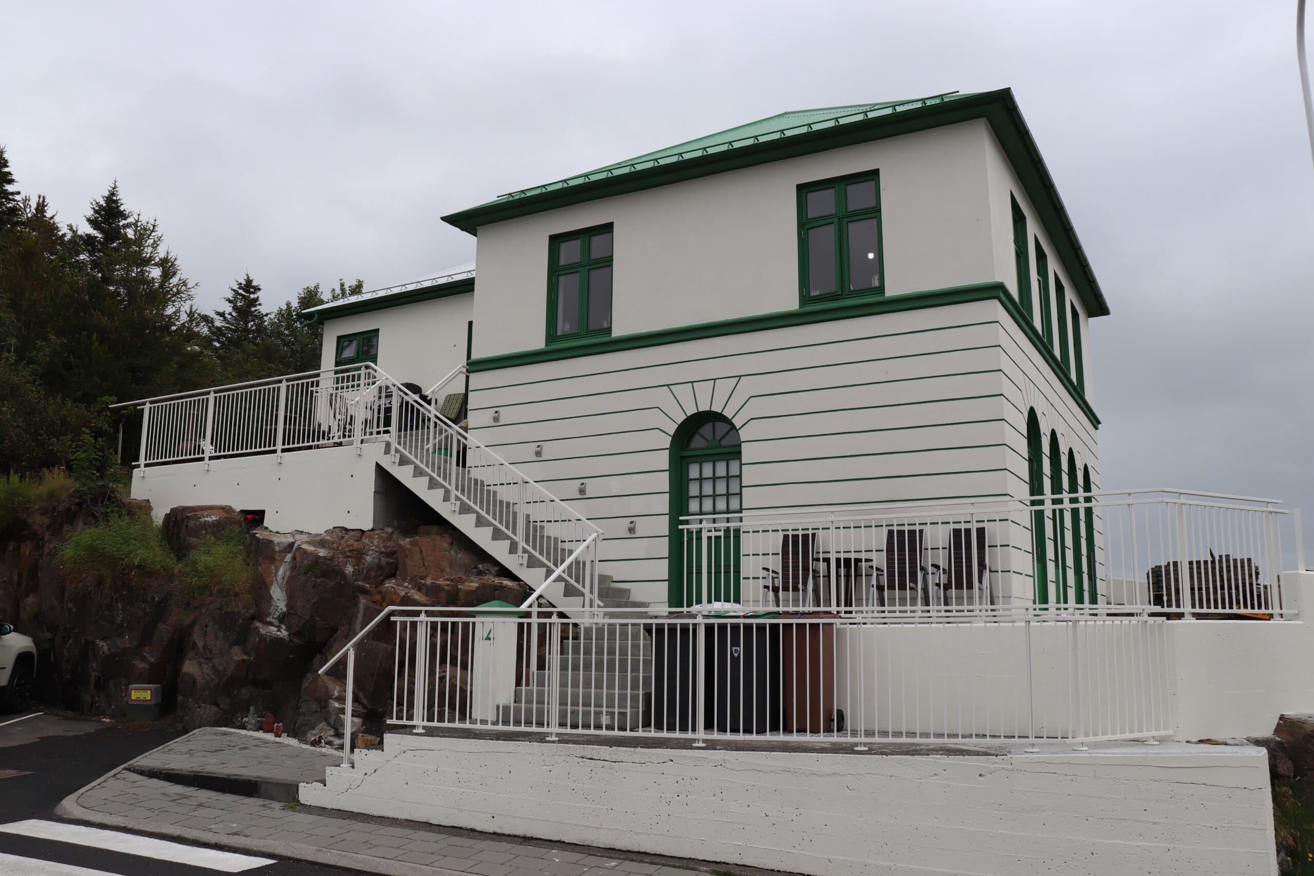 Gamla sparisjóðshúsið í Borgarnesi hefur verið auglýst til sölu. Húsið er ríflega hundrað ára, hannað af Guðjóni Samúelsssyni og byggt árið 1920. Það stendur á holti við Skúlagötu og var á sínum tíma byggt fyrir tvíhliða notkun. Á neðri hæðinni hafði Sparsjóður Mýrasýslu starfsemi en á efri hæðinni bjó þáverandi Sparisjóðsstjóri Magnús Ágúst Jónsson ásamt konu sinni Guðrúnu Jónsdóttur og þremur börnum. Upprunaleg stærð hússins var um 130 fm, um 65 fm hvor hæð, en árið 2020 var reist við það falleg viðbygging samkvæmt teikningum Einars Ingimarssonar arkítekts og stækkaði hún efri hæð hússins allnokkuð. Ásett verð er 115 milljónir króna og er það Nes fasteignasala sem veitir nánari upplýsingar.