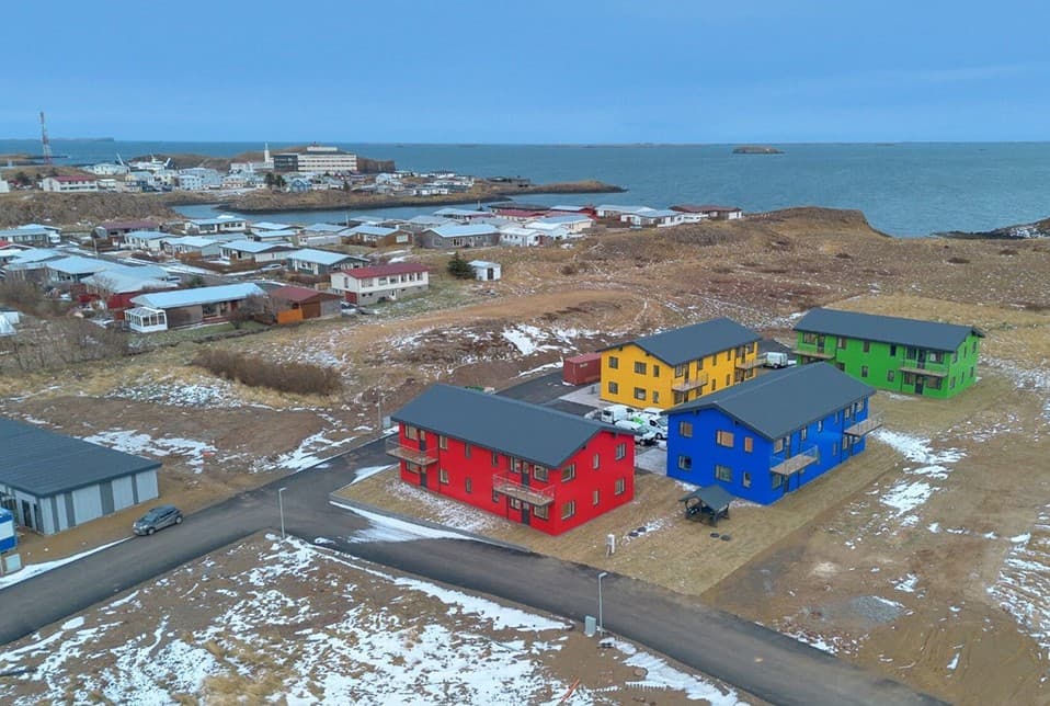 Brák íbúðafélag á 12 íbúðir í Víkurhverfi í Stykkishólmi. Þær eru í gula-, rauða- og bláa húsinu. Í græna húsinu eru einnig fjórar íbúðir en þær eru til sölu á almennum markaði. Ljósm. Helstu fréttir.