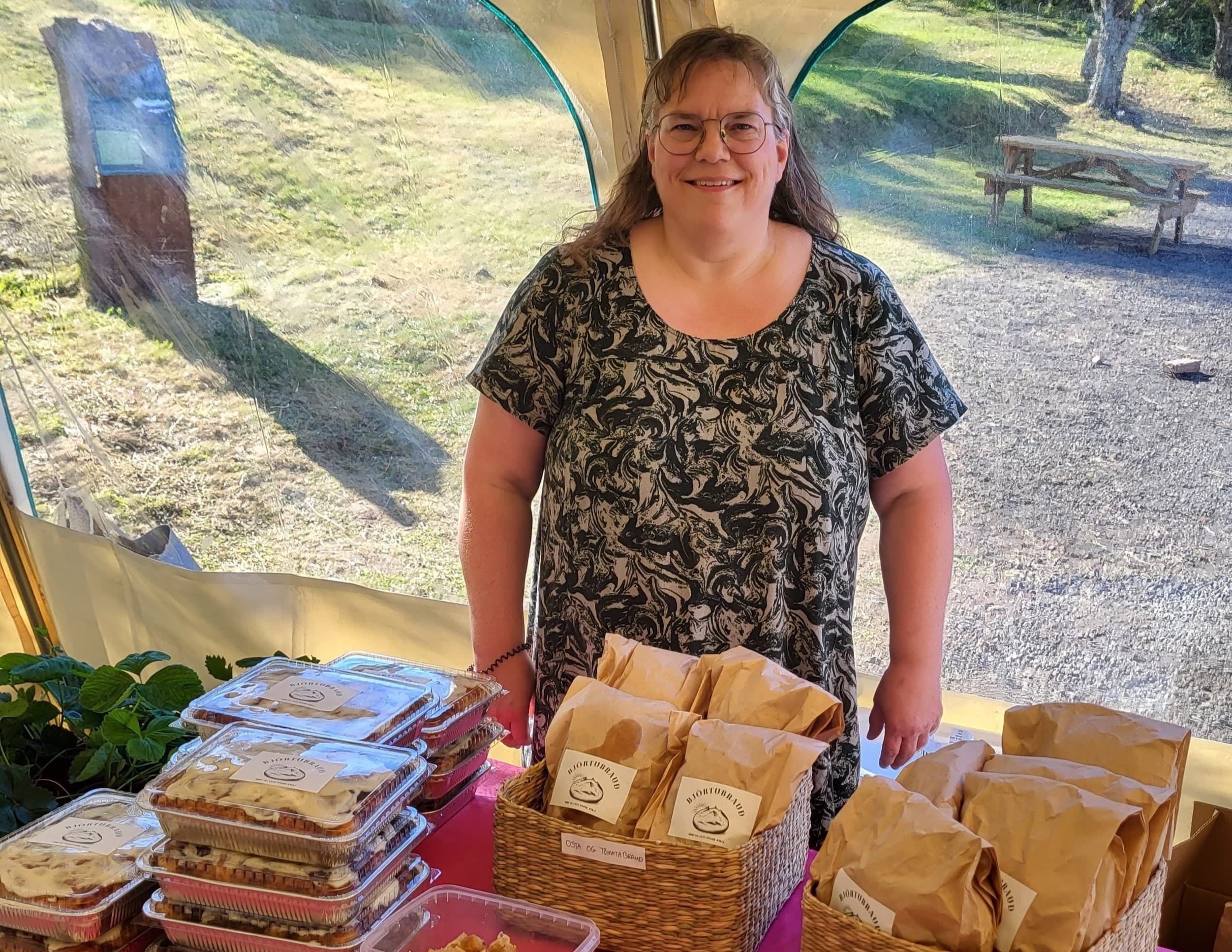 Guðný Heiðbjört. Á söluborðinu er m.a. súrdeigsbrauð með cheddar og sólþurrkuðum tómötum, venjulegt súrdeigsbrauð og kanil-focacciur. Texti: gj – myndir úr einkasafni