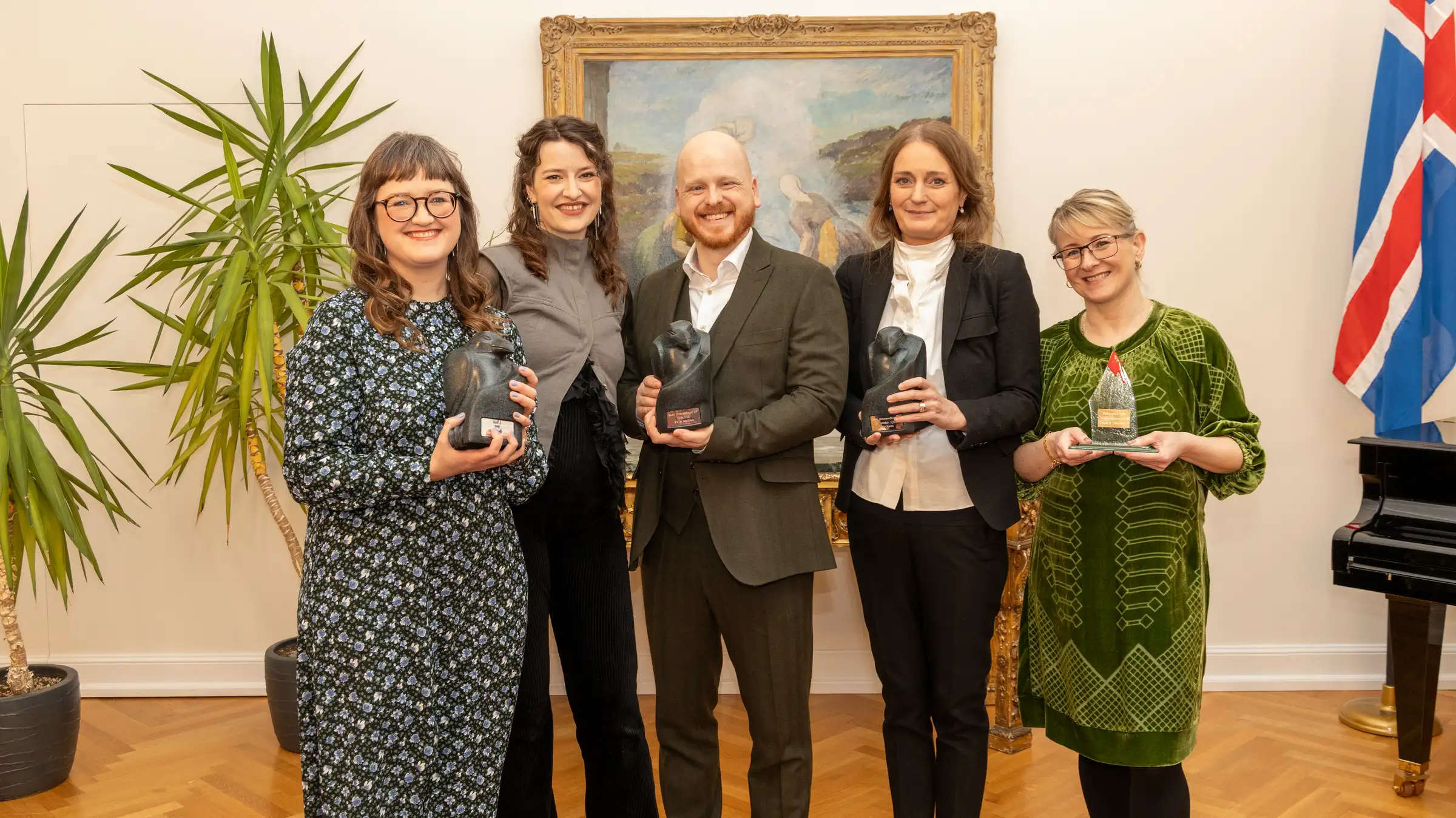 Verðlaunahafar á Bessastöðum. F.v: Sigrún, Elín Elísabet, Ævar Þór, Kristín Svava og Margrét. Ljósm. ruv.is/ Ragnar Visage