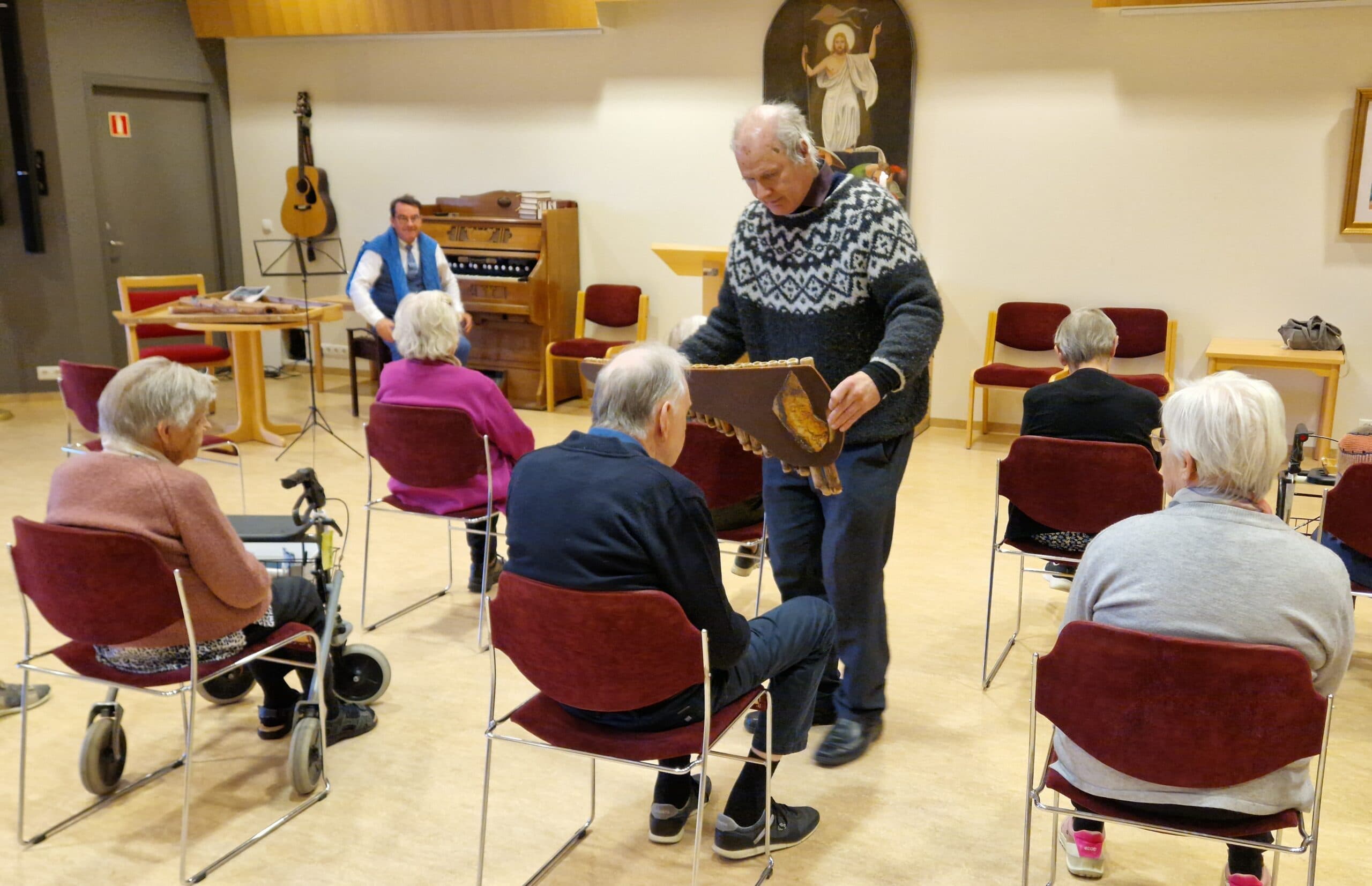 Páll Guðmundsson á Húsafelli mætti í helgistund á dvalar- og hjúkrunarheimilinu Höfða á Akranesi í morgun. Mætti hann með rabarbara- og Pan flautu úr eigin smiðju. Hann lék á hljóðfærin, fór með vísur eftir afa sinn Pál á Hjálmsstöðum og söng „Móðir jörð“ fornt rímnalag með texta eftir Sigurð Breiðfjörð. Á myndinni er Páll að sýna heimilisfólki flautu og fjær við orgelið er Hilmar Örn Agnarsson organisti í Akraneskirkju.