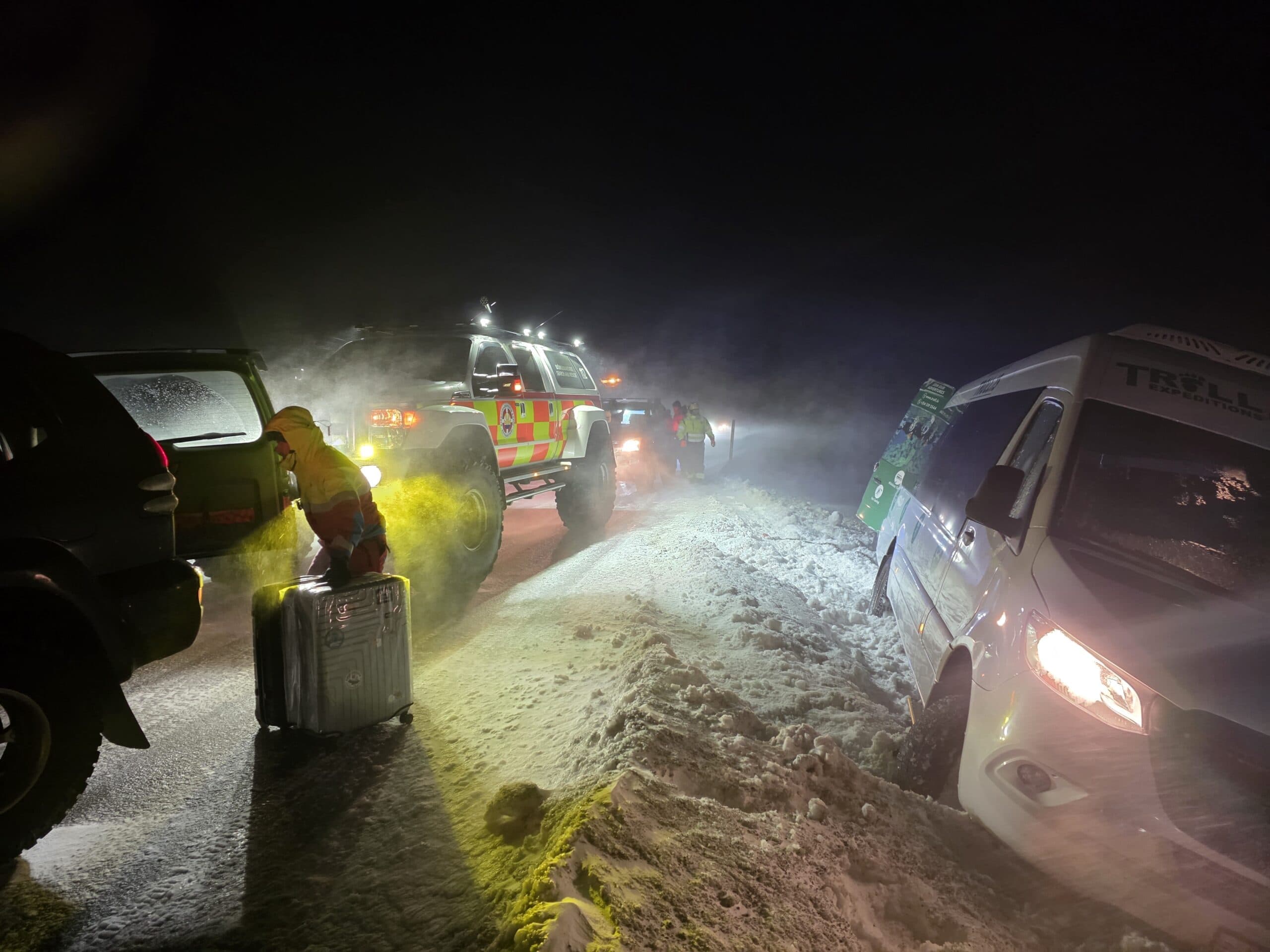 Meðfylgjandi mynd var tekin í Fagradal í gærkvöldi. Þar setti veður strik sitt í ferðaáætlanir nokkurs fjölda þegar hvessti og skyggni versnaði. Nokkurt kóf var á þessum slóðum eins og sést á meðfylgjandi mynd frá Slysavarnafélaginu Landsbjörgu. Björgunarsveitir komu ferðalöngum til aðstoðar.