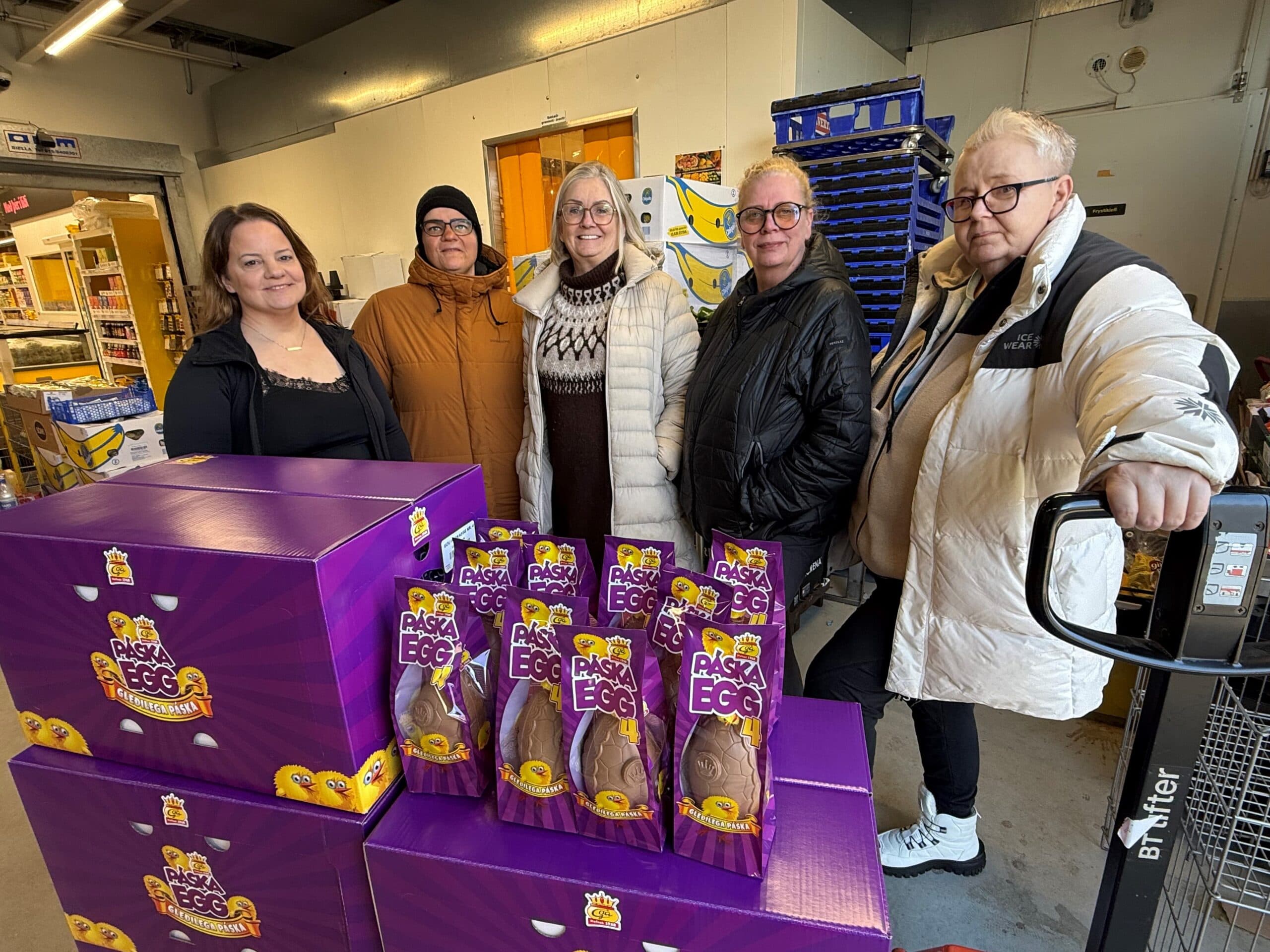 Frá afhendingu 130 páskaeggja á lager Bónuss fyrr í dag. F.v. Guðbjörg Þórunn Sveinsdóttir, Sandra Björk, Sigrún Ríkharðsdóttir, Herdís Jónsdóttir og Rósa Sigurbjörnsdóttir (Lilla).