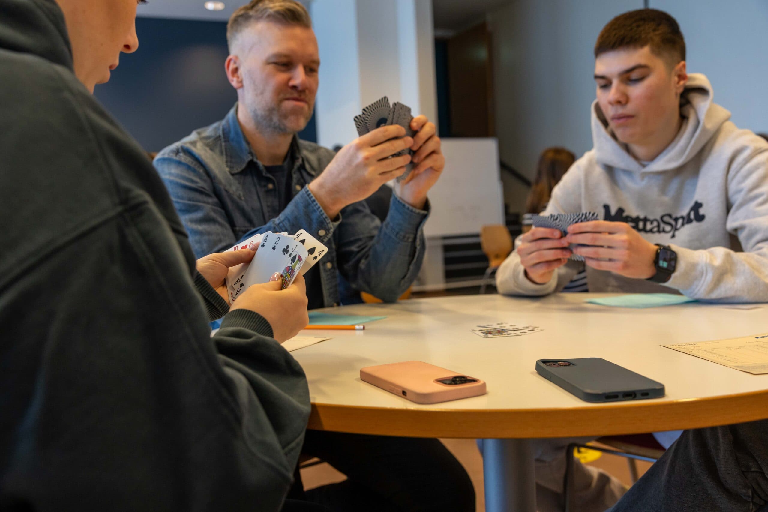 Nemendur og kennarar öttu kappi í félagsvist í matsal skólans.