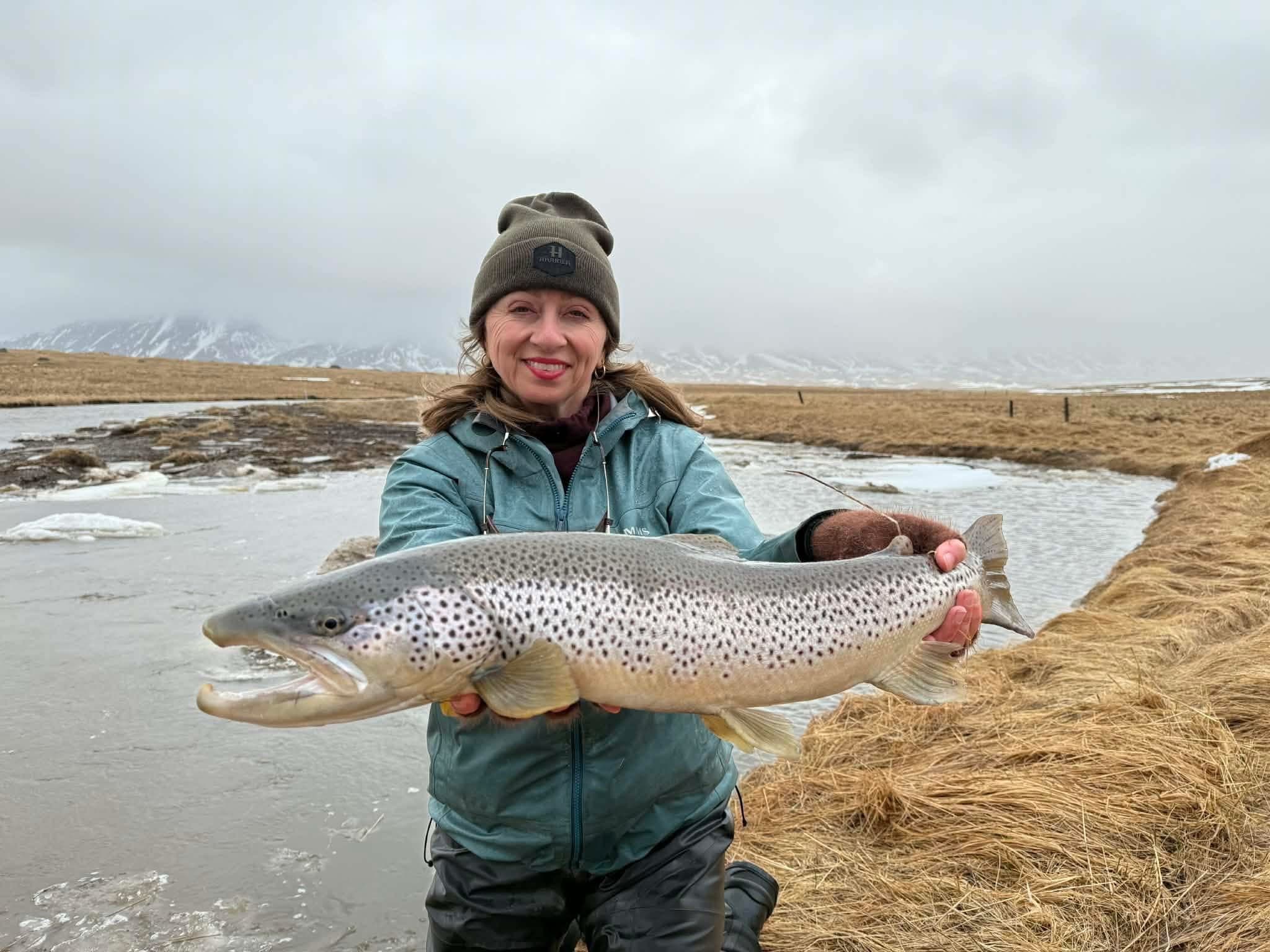08.04.2026 08:17Harpa Hlín Þórðardóttir með þennan flotta sjóbirting við Leirá. Eins og sjá má voru enn stöku ísjakar á ánni. Ljósm. gbLeirá dottin í gírinn Copy Link