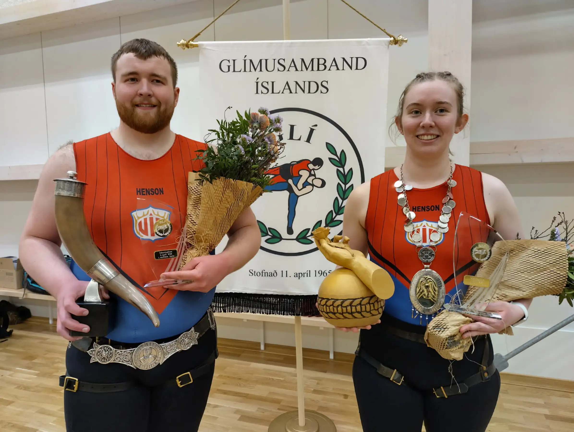 Hákon Gunnarsson með Grettisbeltið og Kristín Embla Guðjónsdóttir með Freyjumenið. Ljósm. ruv.is/ Karl Sigtryggsson