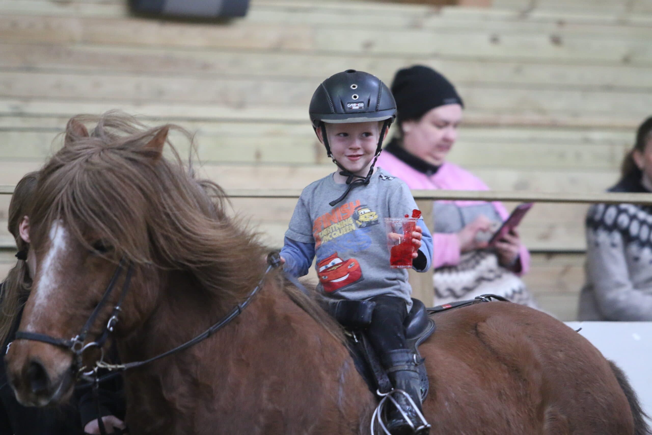 Þrautabrautar, djús- og bjór tölt var haldið hjá hestamannafélaginu Borgfirðingi síðastliðið laugardagskvöld. Mjög skemmtileg kvöldstund og mörg mögnuð tilþrif sem sáust í brautinni. Veitt voru verðlaun fyrir bestu tilþrifin í þrautabrautinni og var það hún Þóra Ólafsdóttir sem hlaut þau eftir að hafa farið seinni ferðina í brautinni með miklum tilþrifum. Eftir að þrautabrautinni lauk var keppt í djús- eða bjór tölti. Og var það tímataka og hversu mikið magn var eftir í glasinu sem gilti til stiga. Hér fyrir neðan komu efstu þrí í hverjum flokki. Næsta laugardag verður svo haldið kvenna- og karlatölt í Faxaborg og hvetur félagið sem flesta til að mæta á pallana og hvetja sitt fólk.