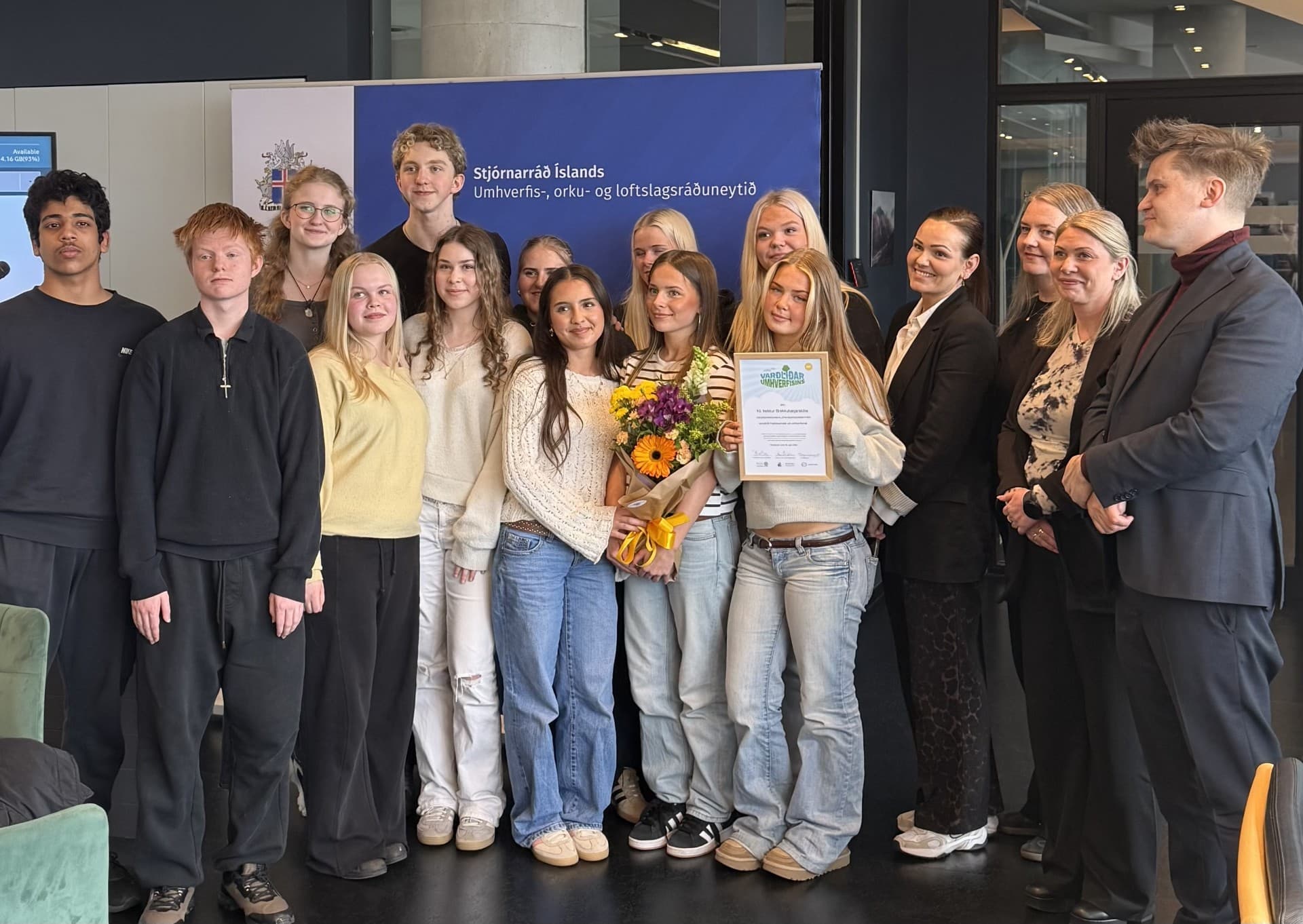 Nemendur í 10. bekk Brekkubæjarskóla taka á móti Varðliðaviðurkenningunni 2026. Ljósm. Stjórnarráðið